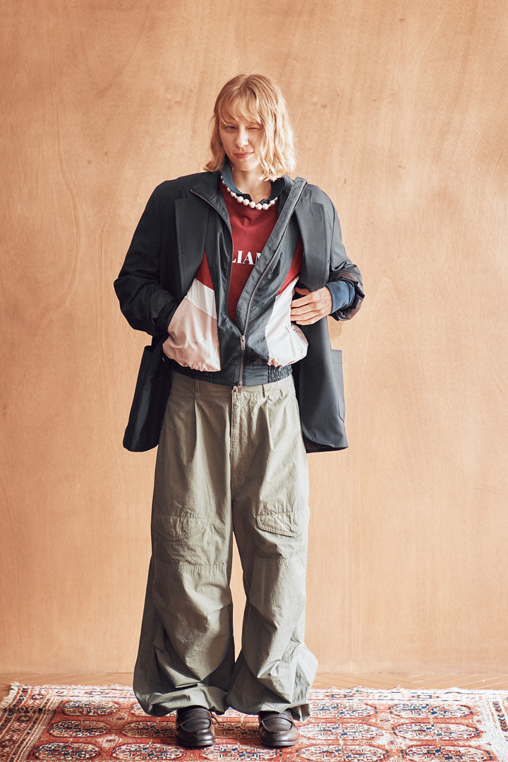ジャケット¥203500/INDIVIDUALIZEDCLOTHING(メイデン・カンパニー)、トラックジャケット¥48400/RHODOLIRION(ネペンテス ウーマン トウキョウ)、Tシャツ¥4950/Healthy DENIM(ゲストリスト)、ポロシャツ¥2662/United Athle(キャブ)、パンツ¥52800/Gurank(にしのや)、ネックレス¥16500/ABISTE(アビステ)、シューズ¥22000/ADIEU TRISTESSE(アデュー トリステス)