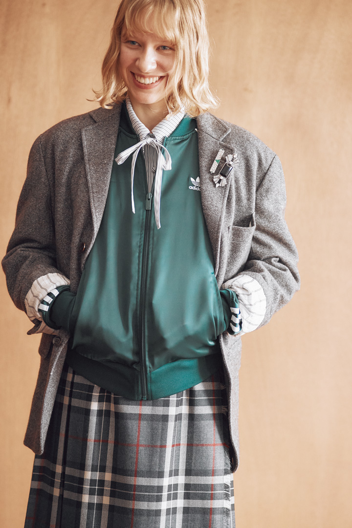 《サイ》のテーラードジャケットにチェックのスカートで英国ムードに浸りつつ、《アディダス オリジナルス》のトラックジャケットでアクティブな魅力を重ねてみる。可憐なリボンブラウスが、新鮮な混沌を生むのも、なんだかいい。