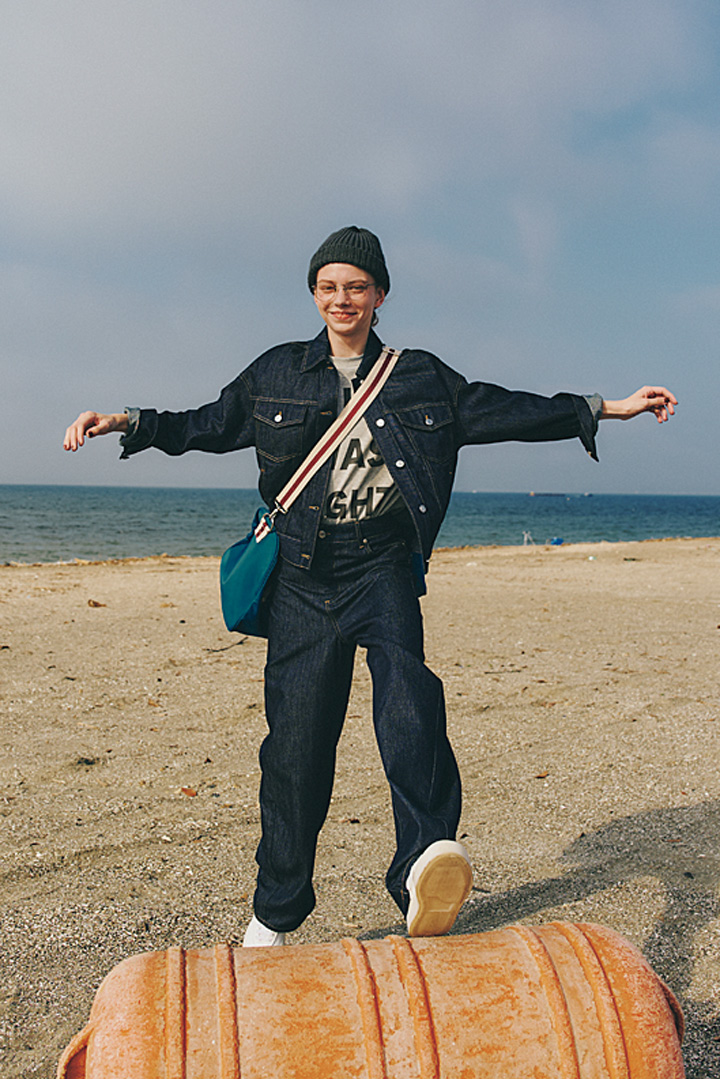 デニムジャケット¥71500、Tシャツ¥30800、デニムパンツ¥56100、バッグ¥48400、スニーカー¥64900/以上すべてMAX&Co.( マックスマーラ ジャパン)、ニット帽¥6050 /HIGHLAND2000(メイデン・カンパニー)、メガネ¥45980/Oliver Peoples(ルックスオティカジャパン カスタマーサービス)