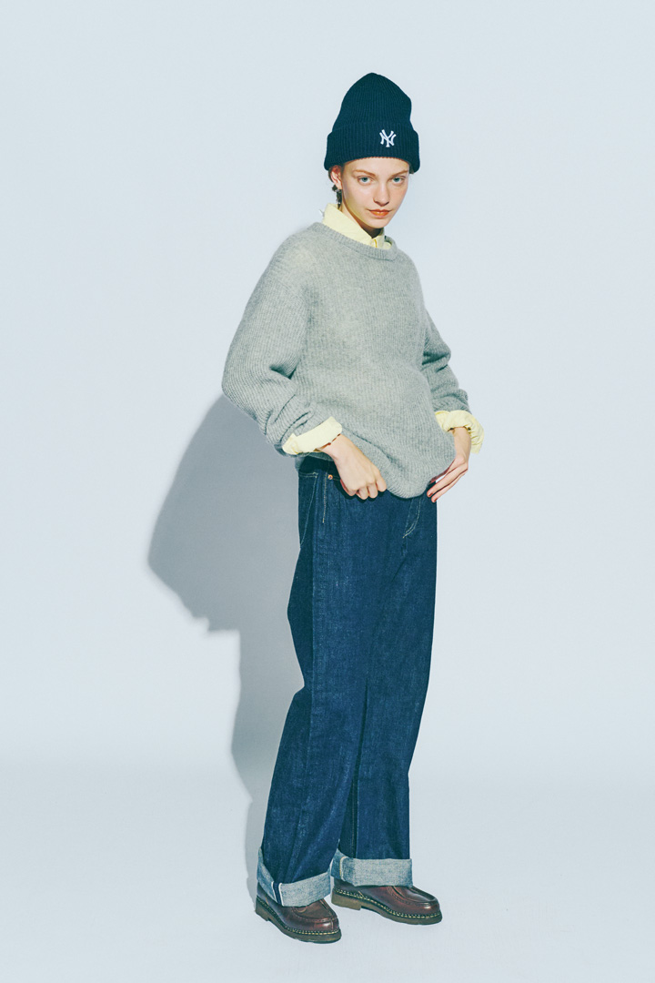 ゆったりとしたシルエット、かつ脚を長く見せてくれるハイウエストが魅力的な《フルカウント》の「モンロー」。ヴィンテージライクなウォッシュド加工の表情に合わせて、セーターとシャツもレトロなカラーリングで。