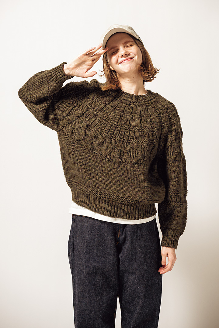 ニットの産地として知られる山形県で、様々なメゾンブランドやアパレルメーカーの製品を手掛けてきたファクトリー〈奥山メリヤス〉によるオリジナルブランド《バトナー》。表情豊かでオリジナリティあふれる編み模様が素敵。セーター¥39600/BATONER(バトナー)、デニムパンツ¥24200/EDWIN(エドウイン・カスタマーサービス)、キャップ¥4620/New Era®︎(ニューエラ)、Tシャツ/スタイリスト私物