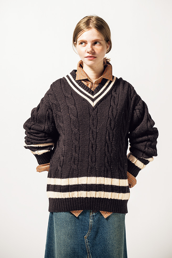 チルデンセーターはVネックを活かしてレイヤードを楽しもう。ブラック×ベージュは絶対かわいい名コンビ。セーター¥19910/OLDDERBY KNITWEAR(セムインターナショナル)、シャツ¥24200/THE SHINZONE(シンゾーン ルミネ新宿店)、デニムパンツ¥9900/Levi’s®︎(リーバイ・ストラウス ジャパン)