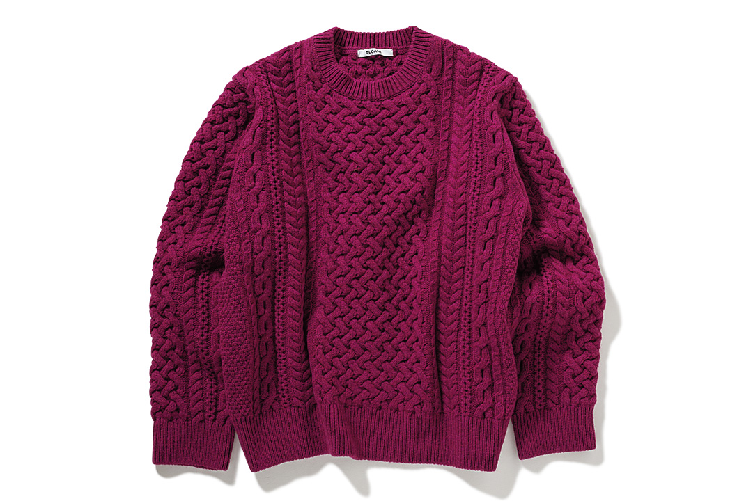 日本生まれのニットブランド《スローン》の1着。チクチク感のない上質なウールを採用。赤みの強い上品なパープルは洒落感たっぷり。¥39600/SLOANE(ザ ショップスローン 新静岡セノバ店)