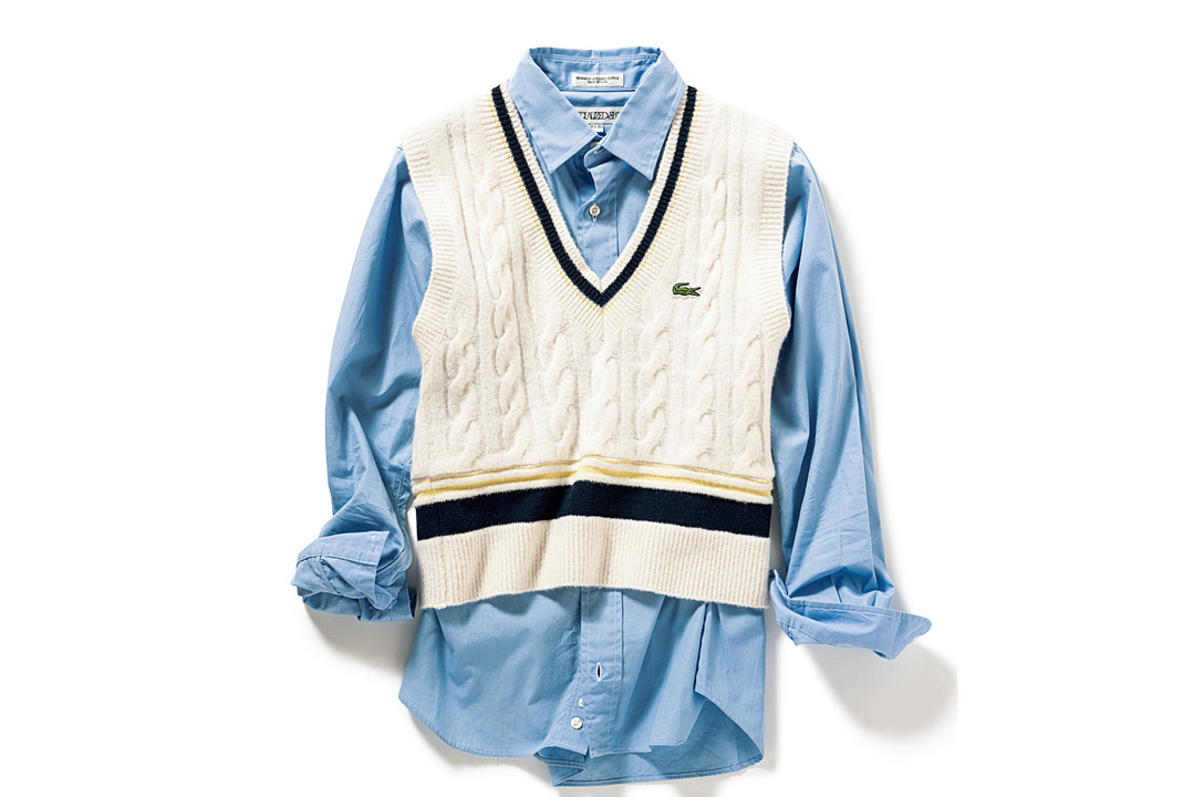 スポーティなムードが香るニットベストには端正なブルーシャツを合わせるのがグッドバランス。ニットベスト¥22000/LACOSTE(ラコステお客様センター)、シャツ¥39600/INDIVIDUALIZED SHIRTS(メイデン・カンパニー)