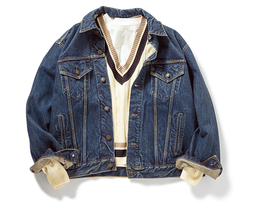 セーターのラインデザインが首元や裾、袖口に効いている。デニムジャケットを重ねても存在感たっぷり。セーター¥26400/FRED PERRY(フレッドペリーショップ東京)、デニムジャケット¥53900/CIOTA(シオタ)、Tシャツ¥9680/SLOANE(ザ ショップスローン 新静岡セノバ店)