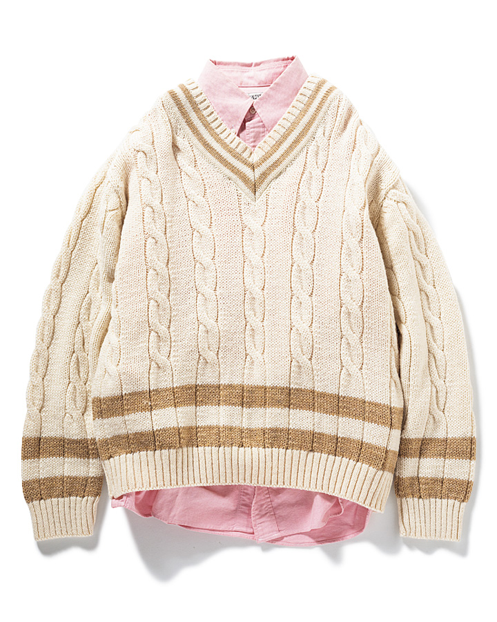 ベージュやホワイトと相性のいいピンクのシャツを忍ばせて愛嬌をプラス。セーター¥19910/OLDDERBY KNITWEAR(セムインターナショナル)、シャツ¥39600/INDIVIDUALIZED SHIRTS(メイデン・カンパニー)