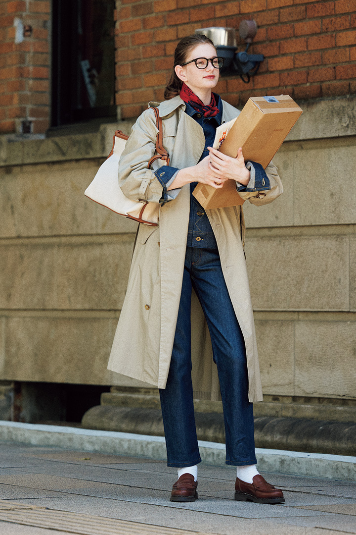 メガネ¥47300/YELLOWS PLUS(コンティニュエ)、コート¥79200/CIOTA(シオタ)、デニムジャケット¥49500/Lee(エドウイン・カスタマーサービス)、デニムパンツ¥30800/A.P.C(. アー・ペー・セー カスタマーサービス)、スカーフ¥24200/A Pieceof Chic(グラストンベリーショールーム)、バッグ¥27500/SOMEWHERE STUDIO(エリオポール代官山)、ソックス[3P]¥3300/THE RAILROAD SOCK(メイデン・カンパニー)、シューズ¥94600/Paraboo(t パラブーツ青山店)