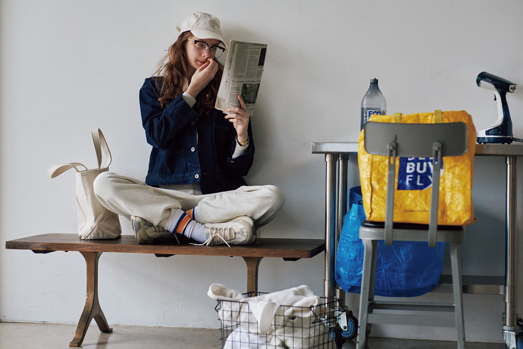 コインランドリーで乾燥を待つ間、今日のニュースのチェックする。起き抜けのスウェットスタイルにデニムジャケットを羽織った格好も、存在感のある《レイバン》のブロウメガネのおかげでしゃんとして見えるから不思議。