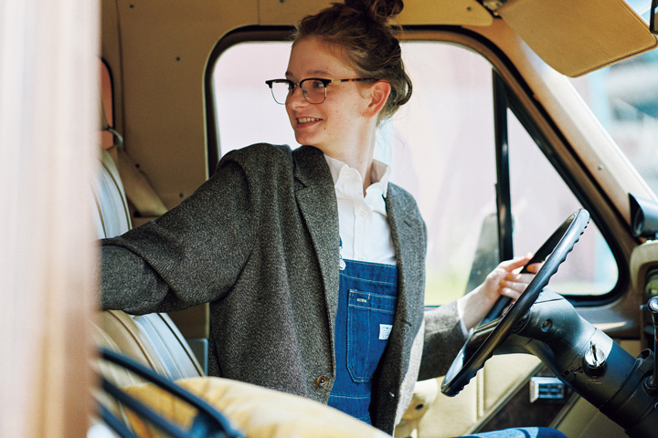 メガネ¥52800/E5 eyevan(アイヴァン PR)、ジャケット¥19910/BEAMS BOY(ビームス ボーイ原宿)、シャツ¥17600/Brooks Brothers(ブルックス ブラザーズ ジャパン)、オーバーオール¥17600/Levi’s®️( リーバイ・ストラウス ジャパン)