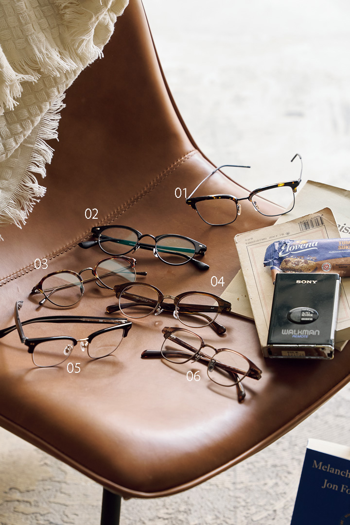 明日はどのメガネと出掛けよう? 01_軽量なチタンとオリジナルアセテートを採用した「TK-12」。ブリッジやエンドピースなどに施された、緻密なフィリグリー細工(金細工)にクラフツマンシップが宿る。¥84700/Oliver Peoples(ルックスオティカジャパン カスタマーサービス) 02_通称“ブロウボストン”と呼ばれる丸みを帯びたフレームを持つ「215」はクリーンな佇まい。パッドはチタン製で経年劣化が少ないのも嬉しい。[レンズ込み価格]¥26400/Reboo(t パリミキ) 03_1917年創業の老舗《カメマンネン》の「KMN1114」は、ほんのりクラウンパントみのあるカタチで個性を演出してくれる。¥55000/KameManNen(アイウェアメビウス) 04_ボリューム感のあるトップが特徴的な「クヌースマーフ」。フレーム自体が大きめでモダンな印象。[ZF241018_43A1/レンズ込み価格]¥15500/Zoff(ゾフ カスタマーサポート) 05_メガネの黄金期と言われる1950~60年代のアメリカンデザインから着想。テンプルの彫金模様がクラシカル。[ZA201016_14E1/レンズ込み価格]¥13300/Zoff(ゾフ カスタマーサポート) 06_ハンサムな見た目をした「BFH-14」。先セルの内側に、滑り止めのスジを施すなど、細部までこだわりが詰まっている。¥23100/THE BEDFORD HOTEL(キングスター)