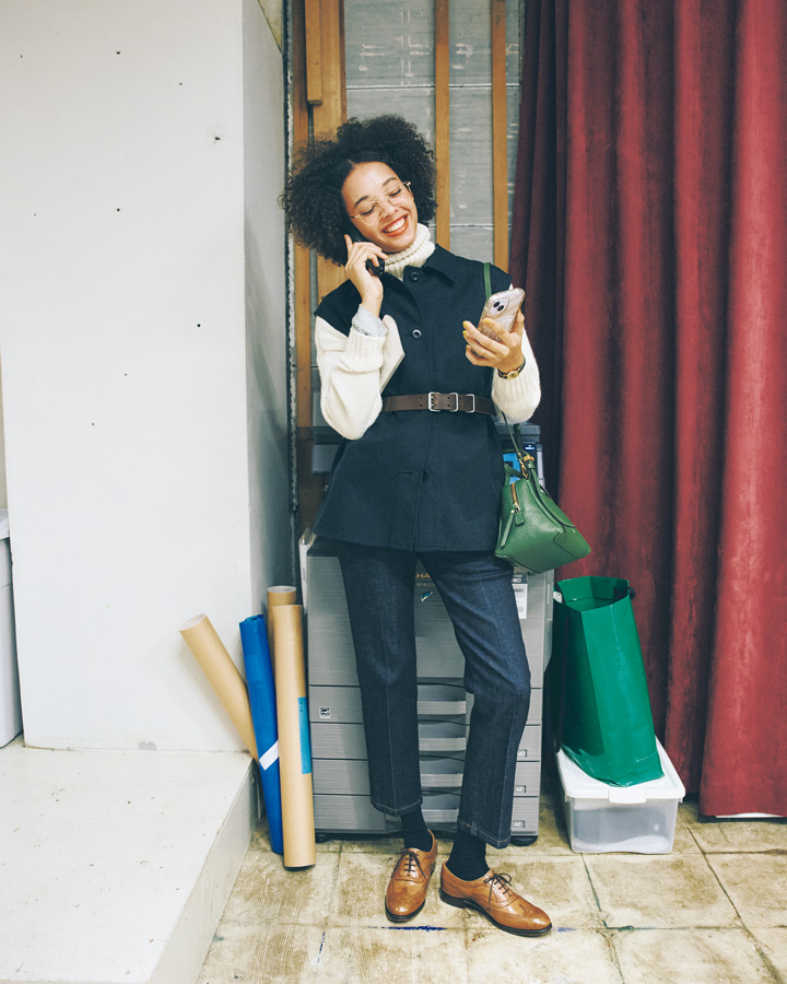 ベスト¥34980、ベルト¥24200/ともにMHL.( エムエイチエル. )、タートルネックセーター¥140800/CABINET(マッハ55リミテッド)、中に着たシャツ¥24200/SOIL(ビューカリック&フロリック)、デニムパンツ¥26400/RED CARD TOKYO(ゲストリスト)、メガネ¥49500/Buddy Optical(アトリエ マクリ)、バッグ¥59400/GIANNI CHIARINI (ジャンニ キアリーニ銀座店)、腕時計¥17600/CLUSE(クルース)、シューズ¥81400/JOSEPH CHEANEY(ブリティッシュメイド 青山本店)、その他/スタイリスト私物