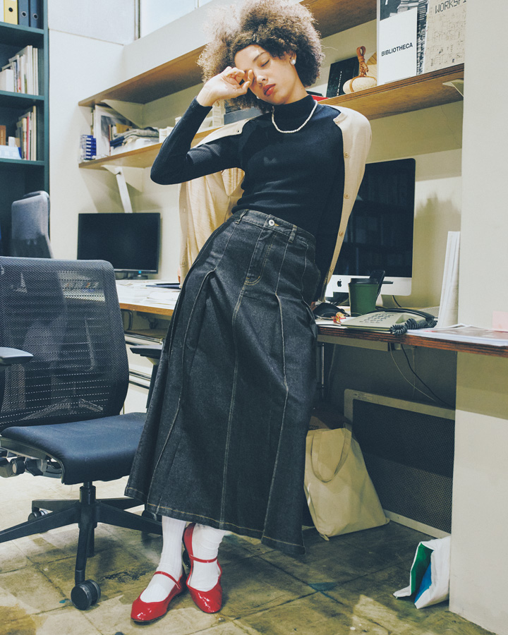 シックなブラック、膝が隠れるロング丈、歩く度にヒラヒラと上品に揺れるプリーツ。そんなデザインなら、デニムスカートだってビジネスに通用する。下半身がボリューミーな分、上半身はコンパクトにまとめてメリハリのあるシルエットをつくればもっと素敵。