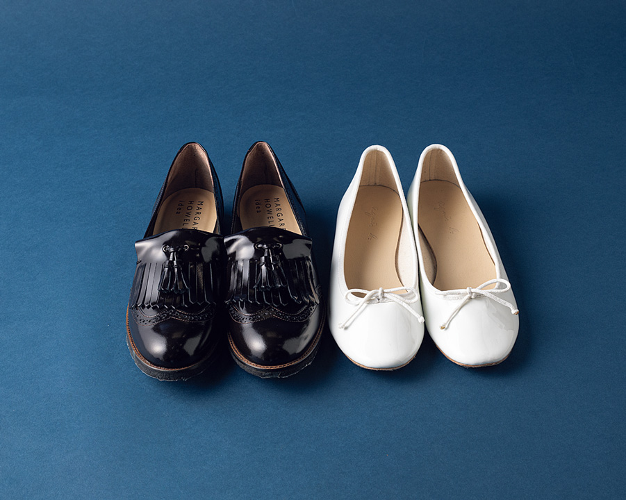 ジェントルライクな革靴も、エレガントなパンプスも、どちらも楽しめるのが女性の特権。艶やかなエナメル素材を選ぶと、きちんと感がアップするのでぜひ試してみて。