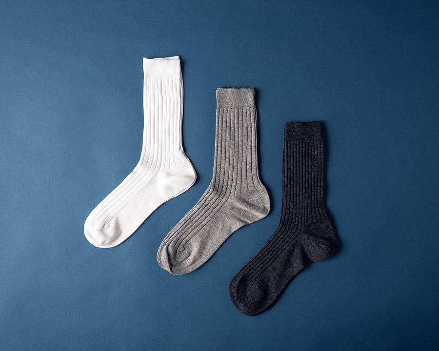 1937年に英国で創業した高級ソックスメーカーの定番品。なめらかで肌触りのいいエジプトコットンを使用し、ハイゲージで編み、リブを細かくすることで品のあるニュアンスに。全28色とカラーバリエーションが豊富だけれど、お仕事シーンには無彩色がいい。