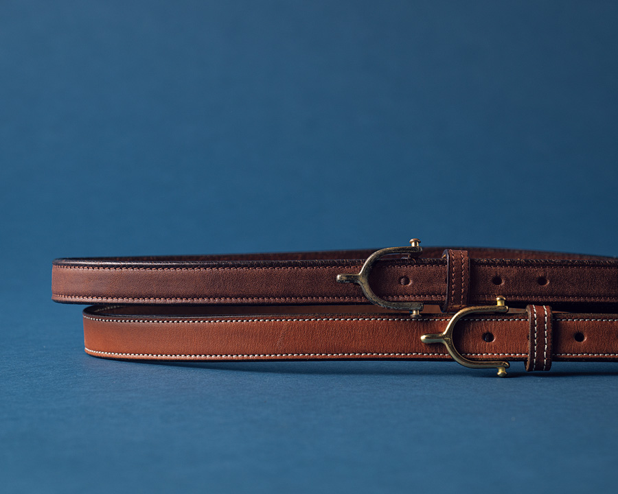 アメリカの良質なブライドルレザーを使用し、熟 練の職人がハンドメイドで仕上げるベルト。馬蹄 (ばてい)から着想を得たバックルのデザインは、 馬具メーカーとして創業した《トリーレザー》らしさを感じる。
