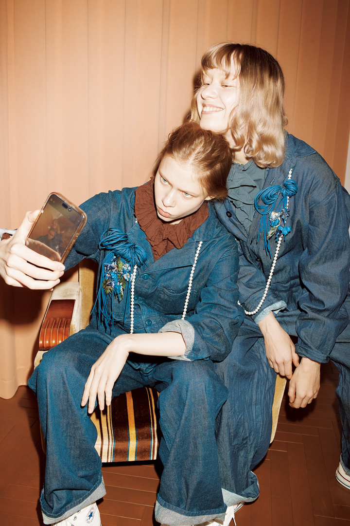 ジャンプスーツのワークムードを裏切るように、襟元には愛らしいフリルを仕込んだ2人。「Lenaはブラウンでメリハリを、Leraはネイビーで馴染ませて大人っぽくしたの」。ですって。胸元のコサージュやパールのロングネックレスで個性も振り撒いたら、おもむろに「Say Cheese!」。デニムがゆっくり自分色に育っていくように、思い出も増えていくのね、きっと。