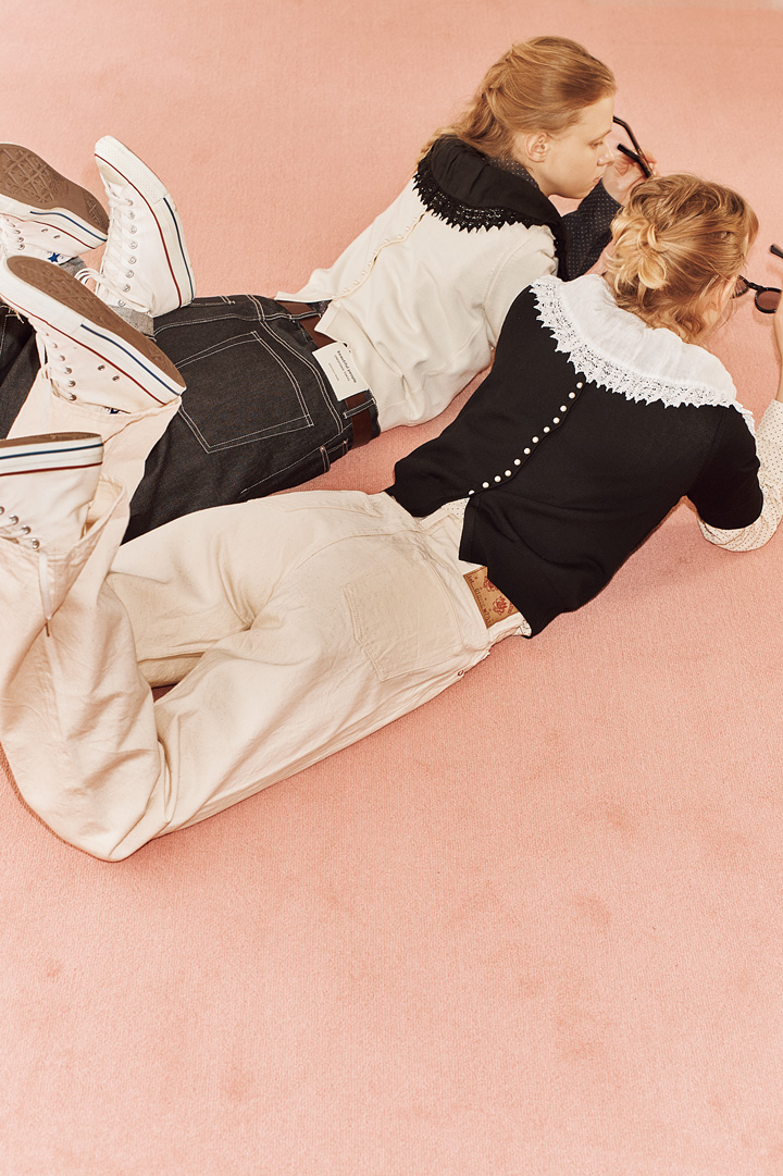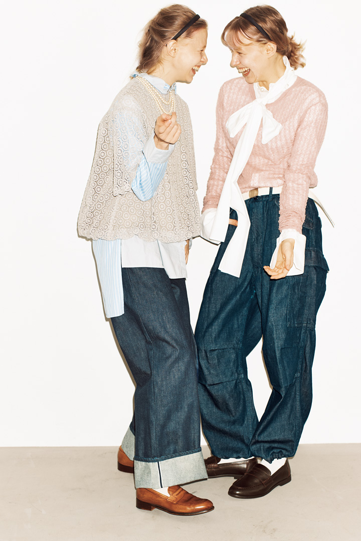 「ワイドシルエットだったり、カーゴタイプだったり、ハンサム感が際立つデニムなら、いつもは気後れしちゃうようなキュートなディテールも、ほどよく中和できるの」。総レースのトップスにパールネックレスを重ねたLena、ピンクのセーターにビッグリボンが揺れるLera。2人はガールズマインドを思う存分発揮!バランス感が絶妙ね。