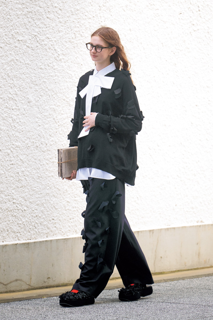 セーター¥49500、ブラウス¥35200、パンツ¥88000、シューズ¥66000、ソックス[ 参考商品] /以上すべてENFÖLD(エンフォルド)、メガネ/スタイリスト私物