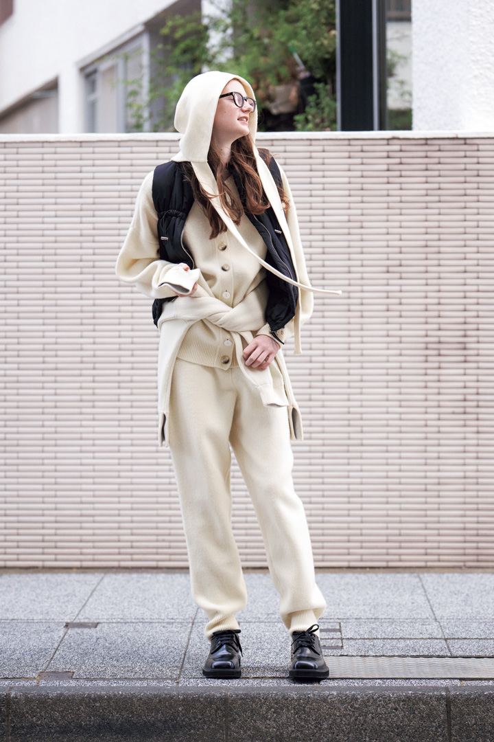 ダウンベスト¥64900、カーディガン¥42900、腰に巻いたセーター¥42900、パンツ¥42900、バラクラバ¥23100、シューズ¥71500 /以上すべてENFÖLD(エンフォルド)、メガネ/スタイリスト私物