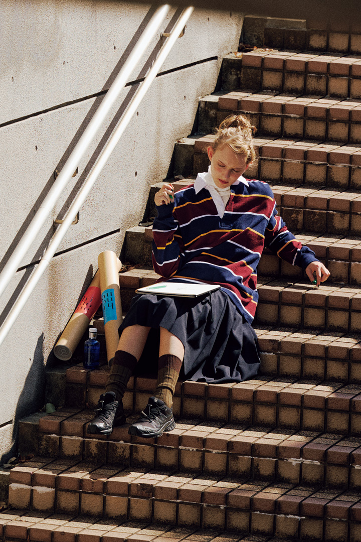 美術大学の階段に学生さんを発見。ピカソも愛したボーダー柄をスポーティに取り入れて、真剣にスケッチに取り組んでいる。ところでラガーシャツに襟があるのは、試合後の交流会へそのままジャケットを羽織って参加するため、なんだって。