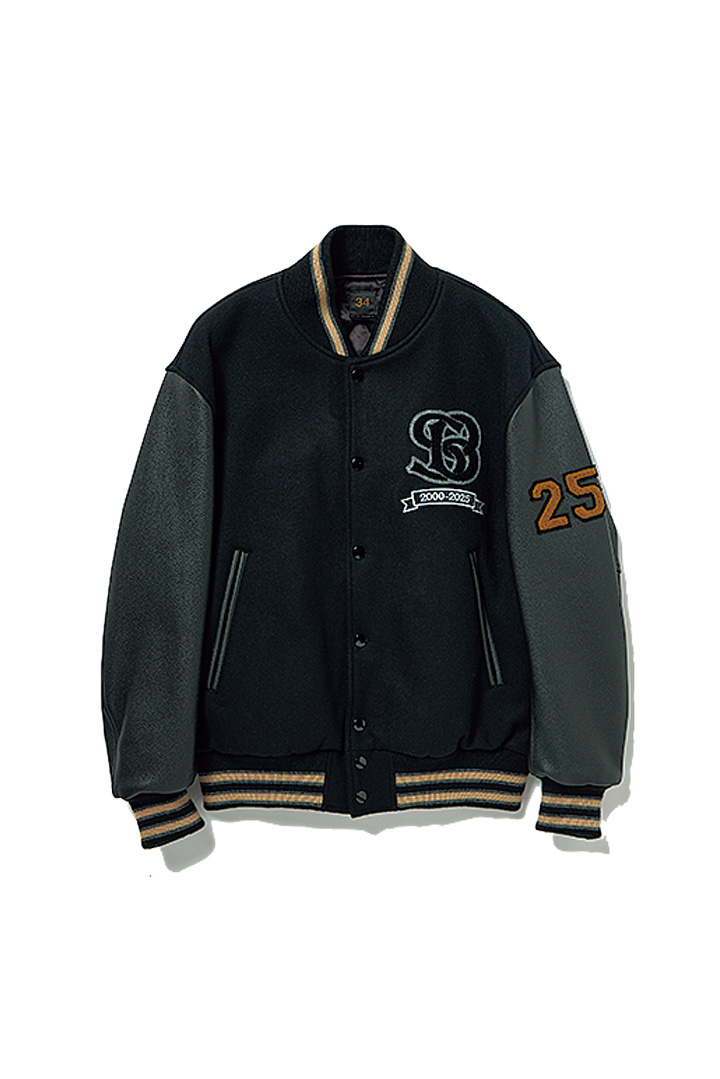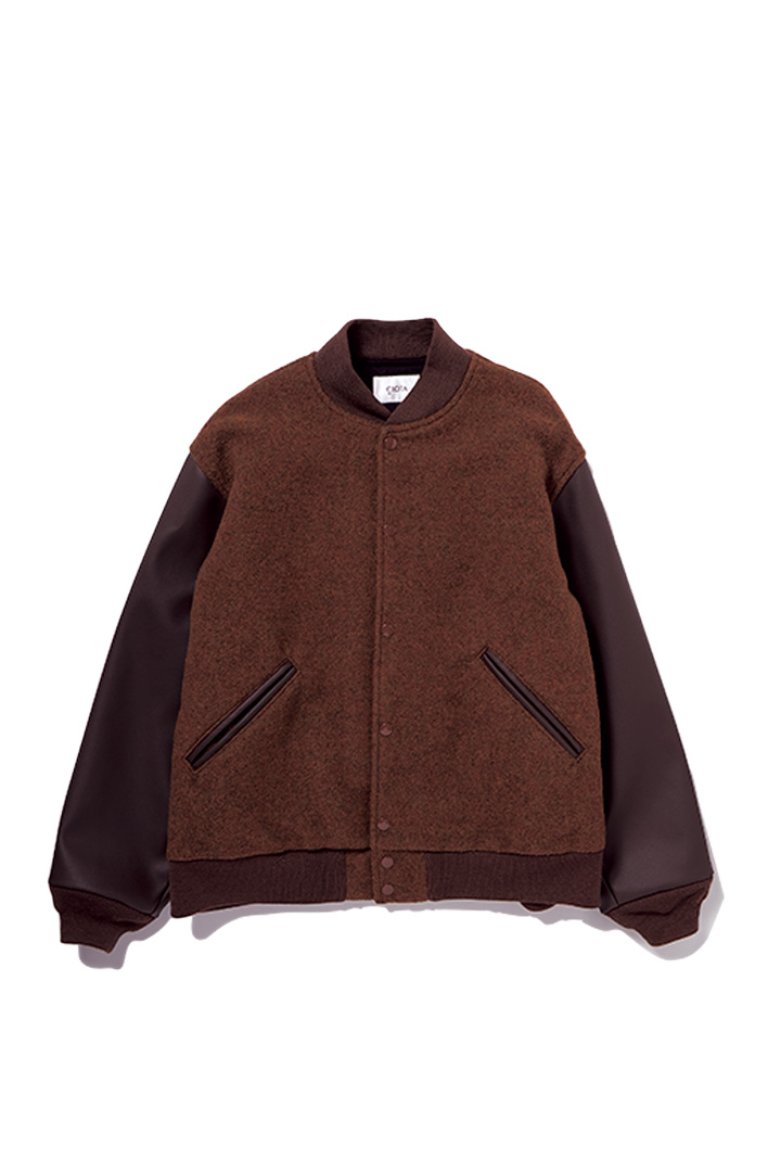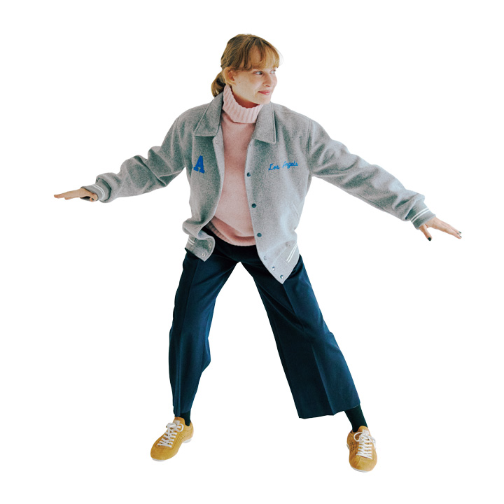 本場では“VARSITY(代表チーム) JACKET”と呼ばれるように、かつては好成績を残した選手にのみ与えられる勲章だったスタジャン。代名詞的ブランドである《スクーカム》のオーセンティックな1着を、ピンクのセーターでやわらかい表情にアレンジ。