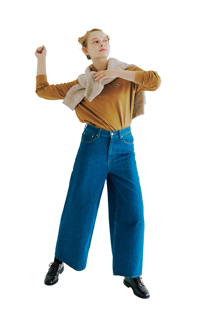 ポロシャツ[メンズ]¥18700/LACOSTE(ラコステお客様センター)、肩に巻いたセーター¥29700 / PEREGRINE( 真下商事)、デニムパンツ¥31900/Traditional Weatherwear (トラディショナル ウェザーウェア 渋谷店)、シューズ¥68200/SANDERS(サンダース ジャパン)