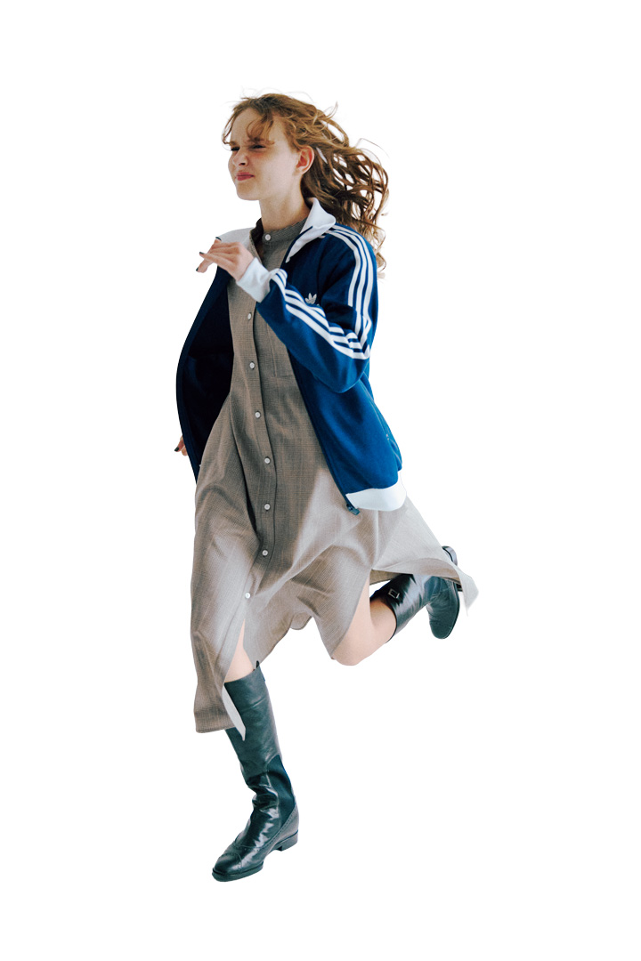 ジャケット¥13200/adidas(アディダスお客様窓口)、ワンピース¥53900/Traditional Weatherwear(トラディショナル ウェザーウェア 渋谷店)、ブーツ¥99000/KATIM(カチム)