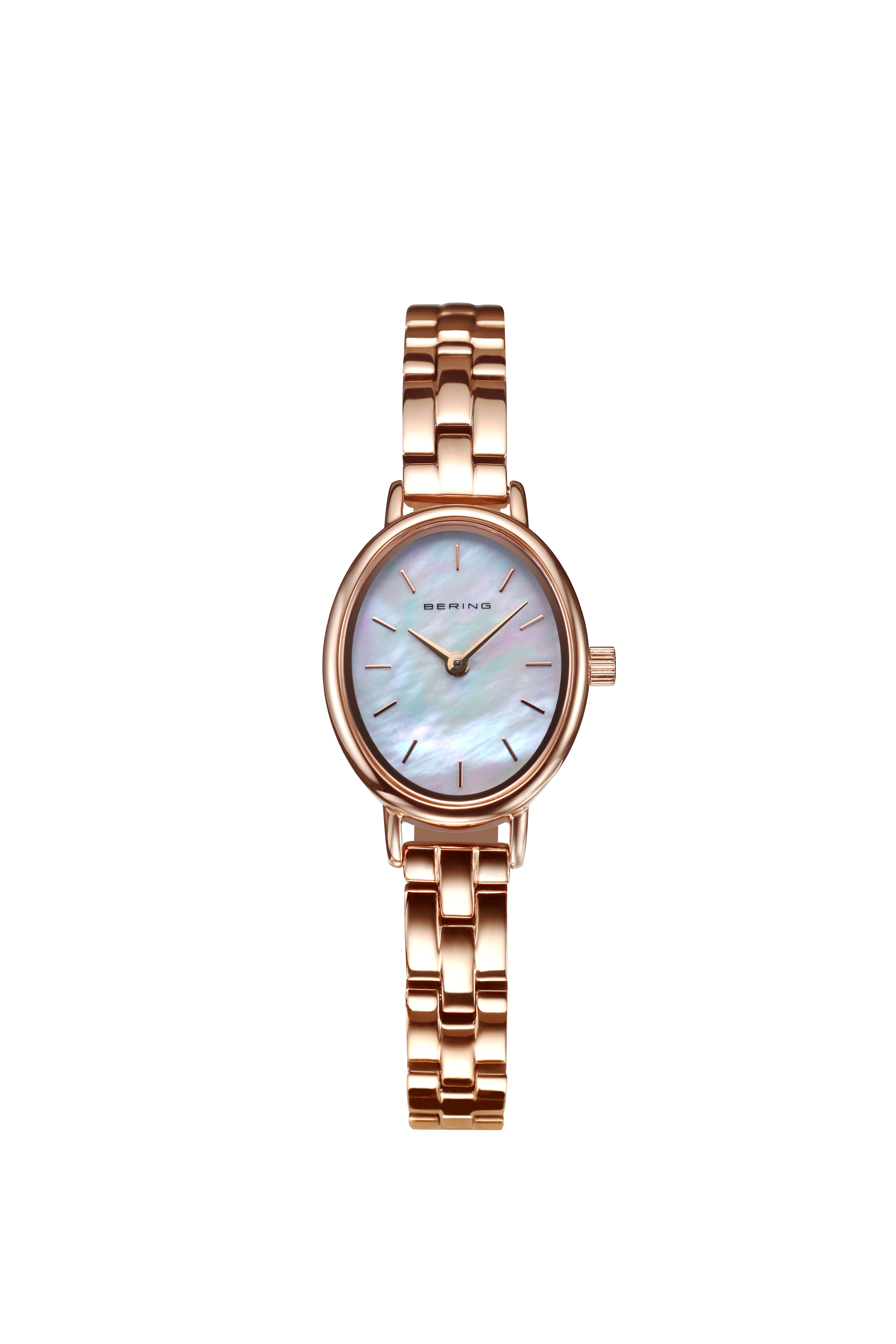 お店の扉を気にしながら、どこかソワソワした雰囲気でコーヒーを飲む彼女。フリル袖のワンピースにカチューシャ、そして品のよいローズゴールドウォッチ。今日はきっとデートの日なのだろう。美しくきらめくパールの文字盤に、女性らしい小ぶりのオーバルデザイン……、乙女なあの子の手元を彩る腕時計は、待ち合わせの5分前を指している。