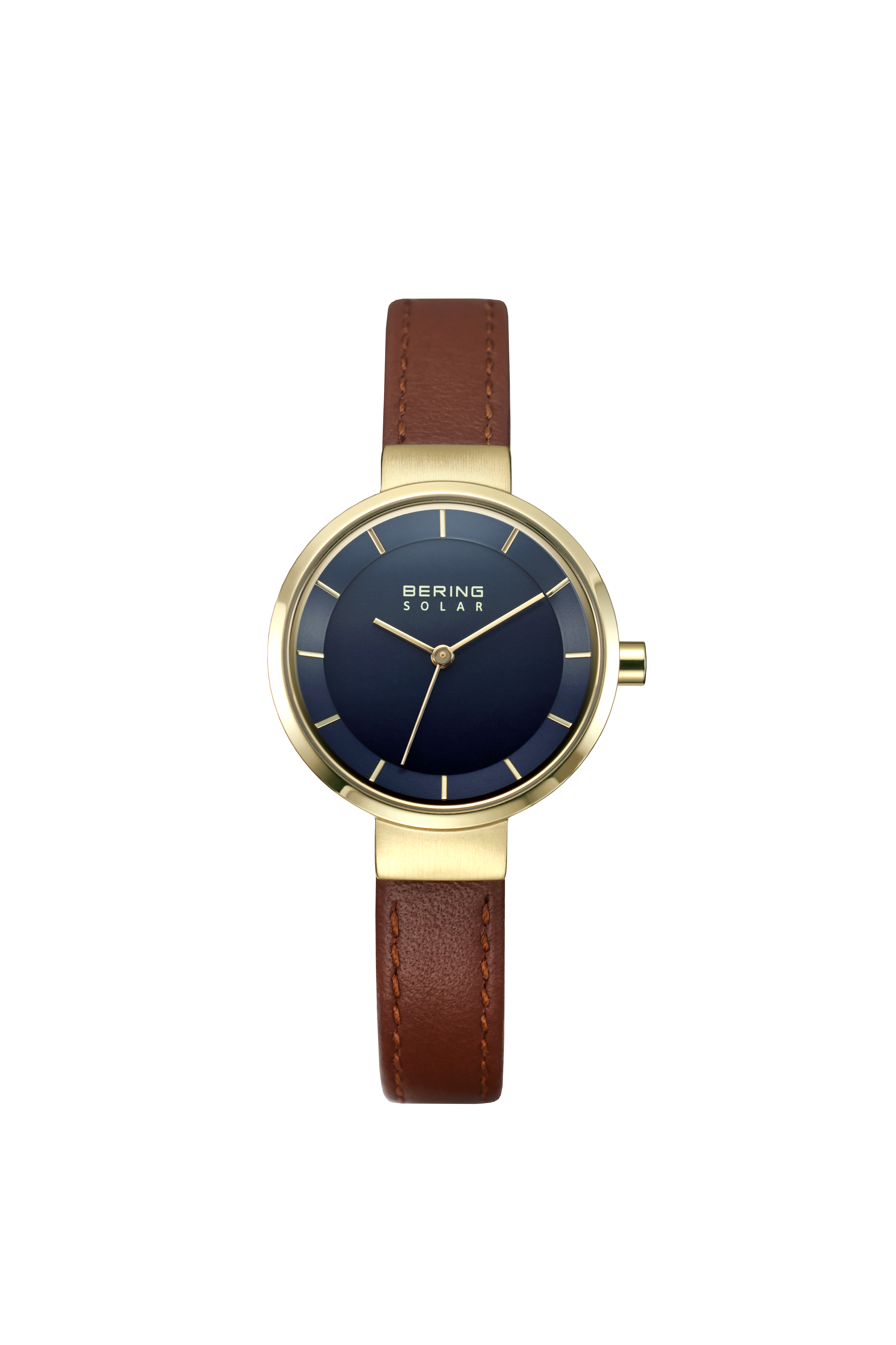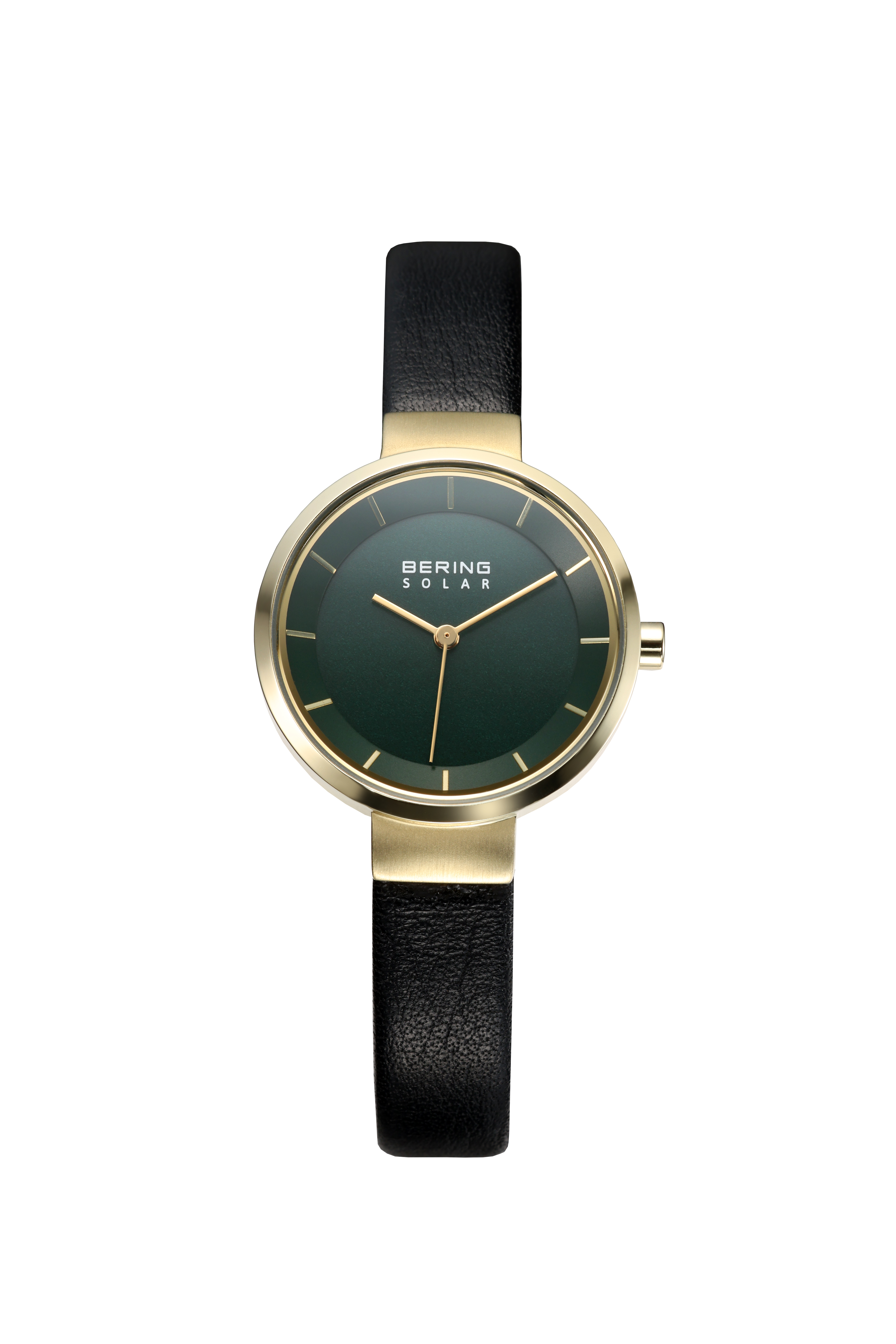 すり鉢形状の文字盤が印象的なアイコンシリーズ「スカンジナビアンソーラー」に、レザーストラップを採用した新色が登場。深めのネイビーとグリーンの文字盤で落ち着いた印象に。ケースサイズは27mm。