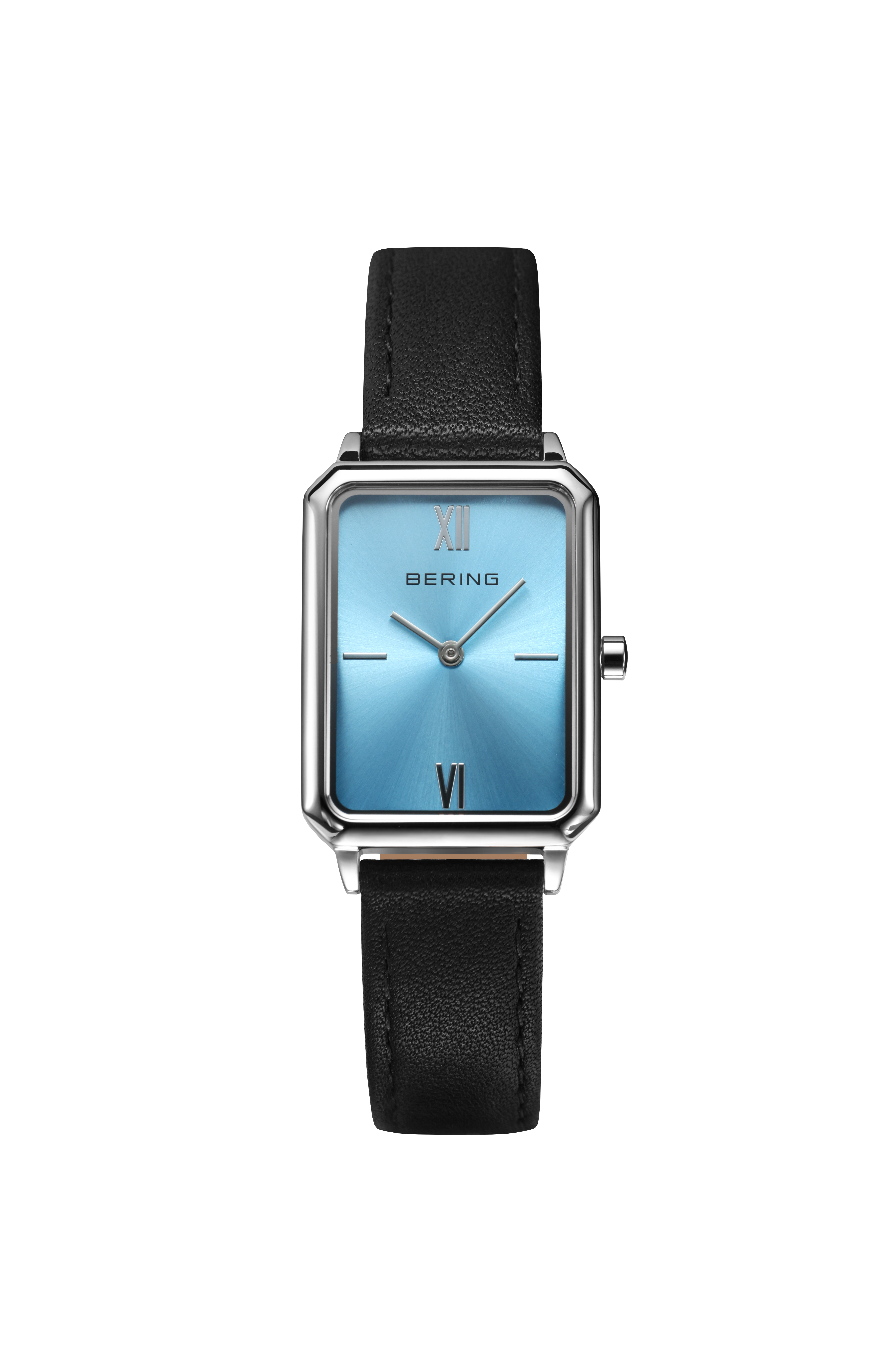 端正なブラックのレザーベルトと、鮮やかなアイスブルーの文字盤が生み出す、美しいコントラストが魅力。フェイスにはサファイアガラスを採用し、傷がつきにくいのも嬉しいポイント。