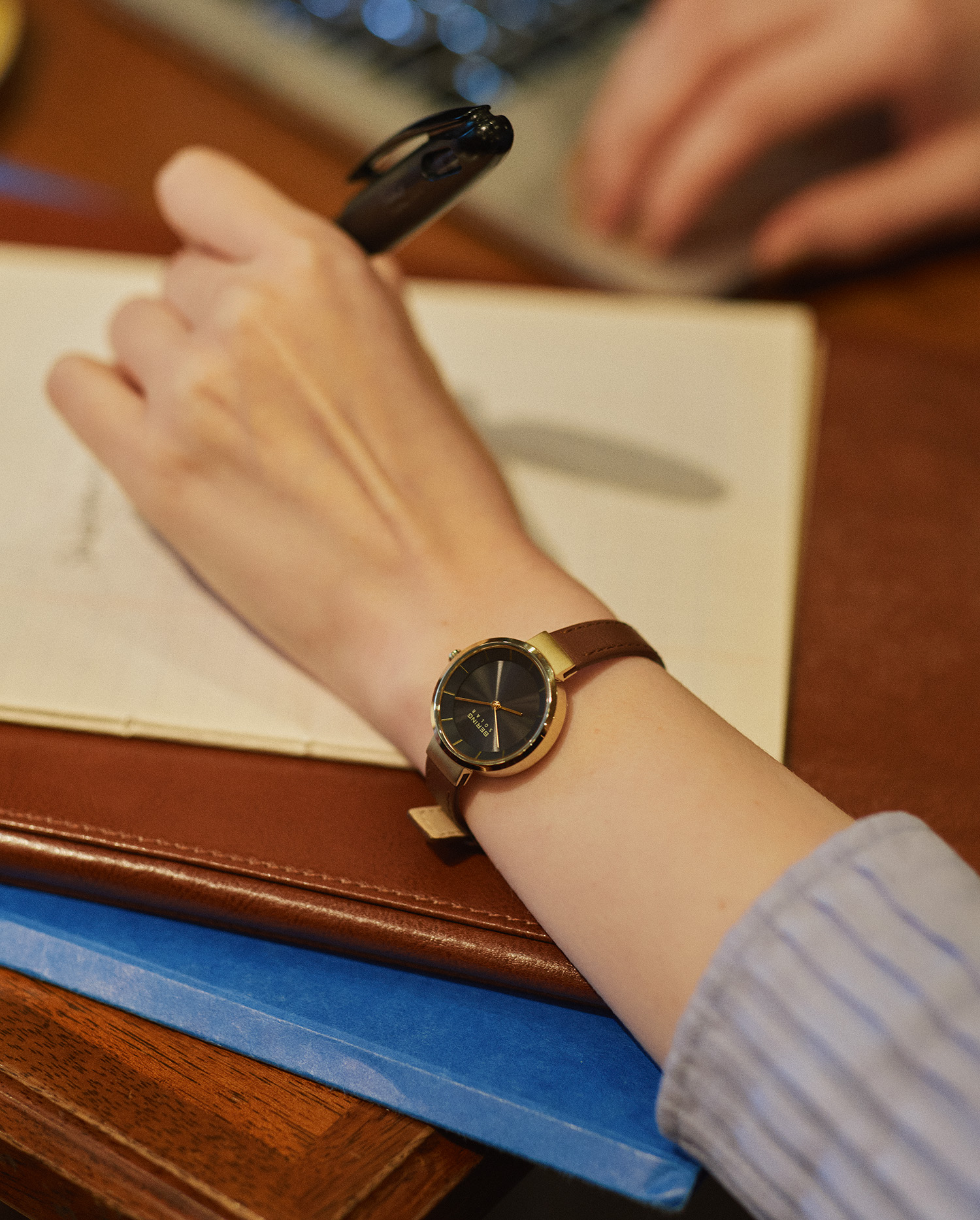 時刻は午前8時。朝早くに見かけた彼女は、なにやらパソコンとにらめっこ。仕事の日は身だしなみに抜かりなく、もちろん腕時計も忘れない。深いネイビーの文字盤に細身のブラウンレザーを合わせた大人顔の相棒が、頑張るお仕事ガールをそっと見守っている。