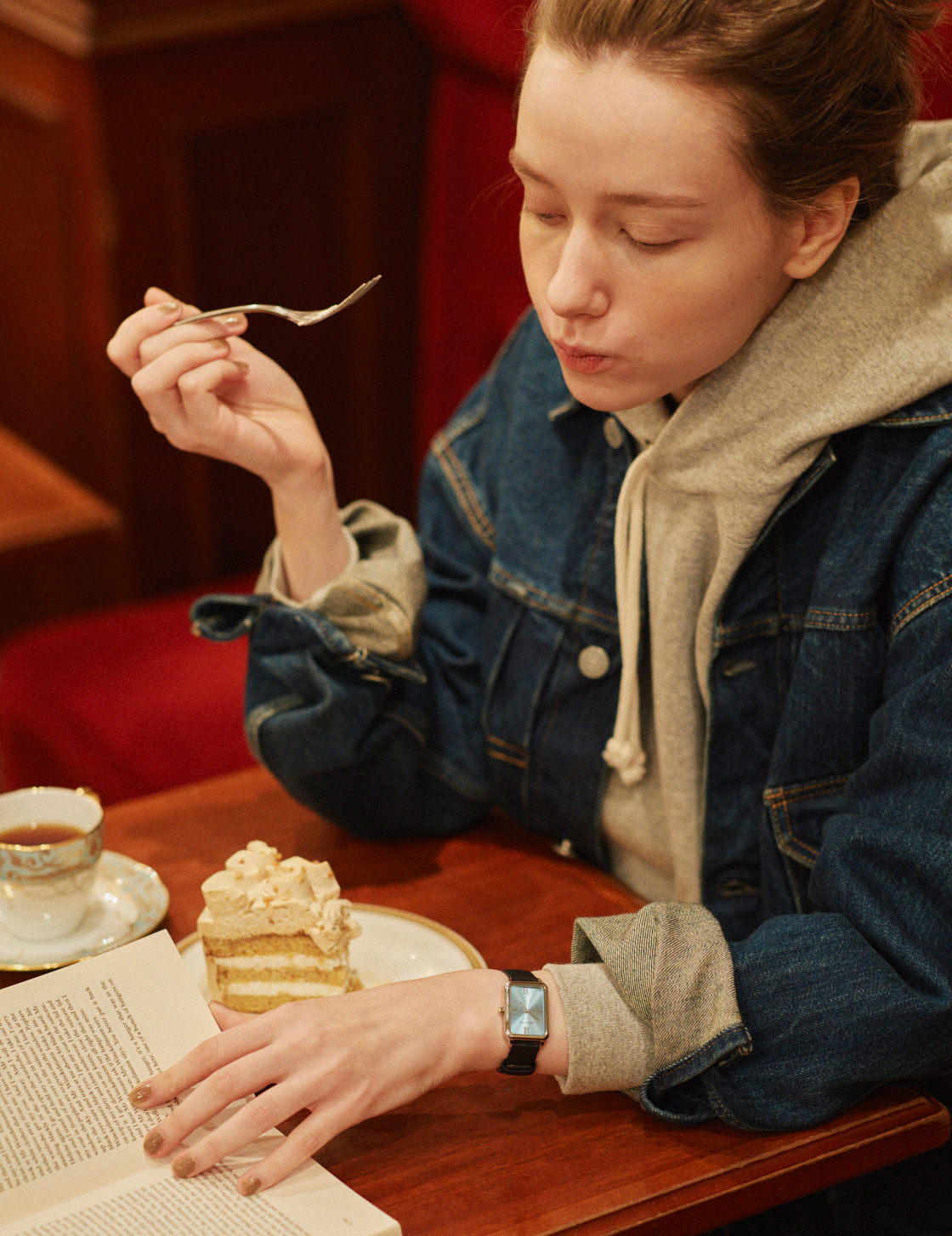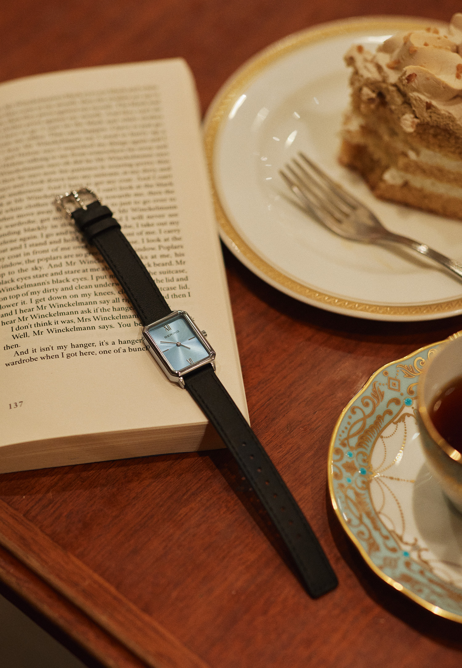 おやつの時間をちょっぴり過ぎた頃。ケーキと読書を楽しむ彼女の腕には、今日も腕時計がキラリ。デニムジャケットと好相性なアイスブルーのフェイスに、シルバーの装飾、スクエアフォルムがクールな印象を醸し出す1本が、ラフなスタイルをキリリと引き締める。