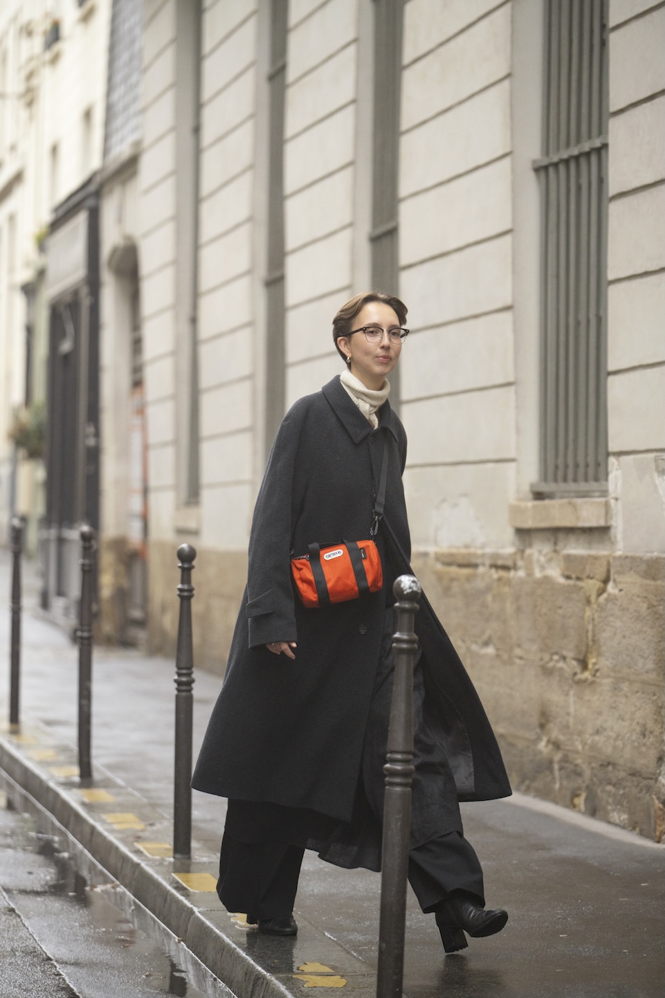 しっとりとした冬のパリを行く、モノトーンスタイルのKristiane。コート、スカート、パンツを巧みにレイヤードし、黒支度を立体的に仕上げてみせた。装いのスパイスとして取り入れたのは、貴重品を収めるのにぴったりなミニ「ロールボストン」。アクティブなオレンジがいいアクセントになってる。