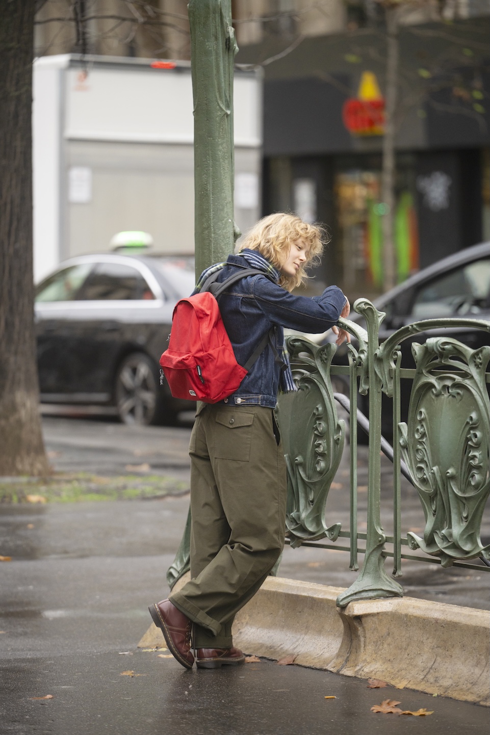 パリの街にすっと溶け込む、植物の茎のようなゲートはメトロ(地下鉄)の入り口。友達と待ち合わせ中のLucieは駆け出しのフォトグラファー。トーンを絞ったワークスタイルに映える《アウトドアプロダクツ》の真っ赤なデイパックには、愛用しているカメラやポートフォリオを入れているんだって。