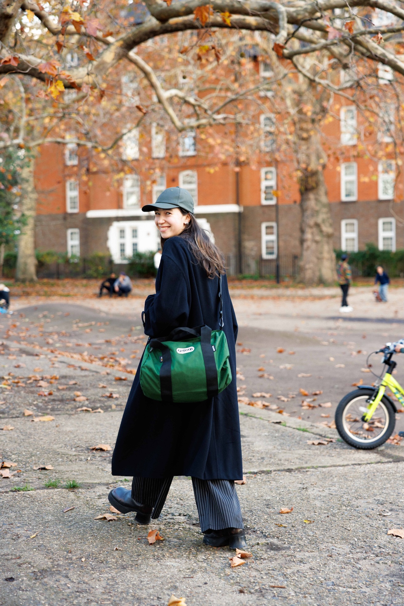 シンプルシックな着こなしを、キャップと「ロールボストン」でスポーティに味付け。ダークトーンに落ち着きがちな冬こそ、彼女のようにバッグで色を取り入れてみて! ころんと丸いフォルムも相まって、着こなしをぐっと印象づけてくれる。パソコンや水筒まですっぽり入るので、お仕事にも活用しているそう。
