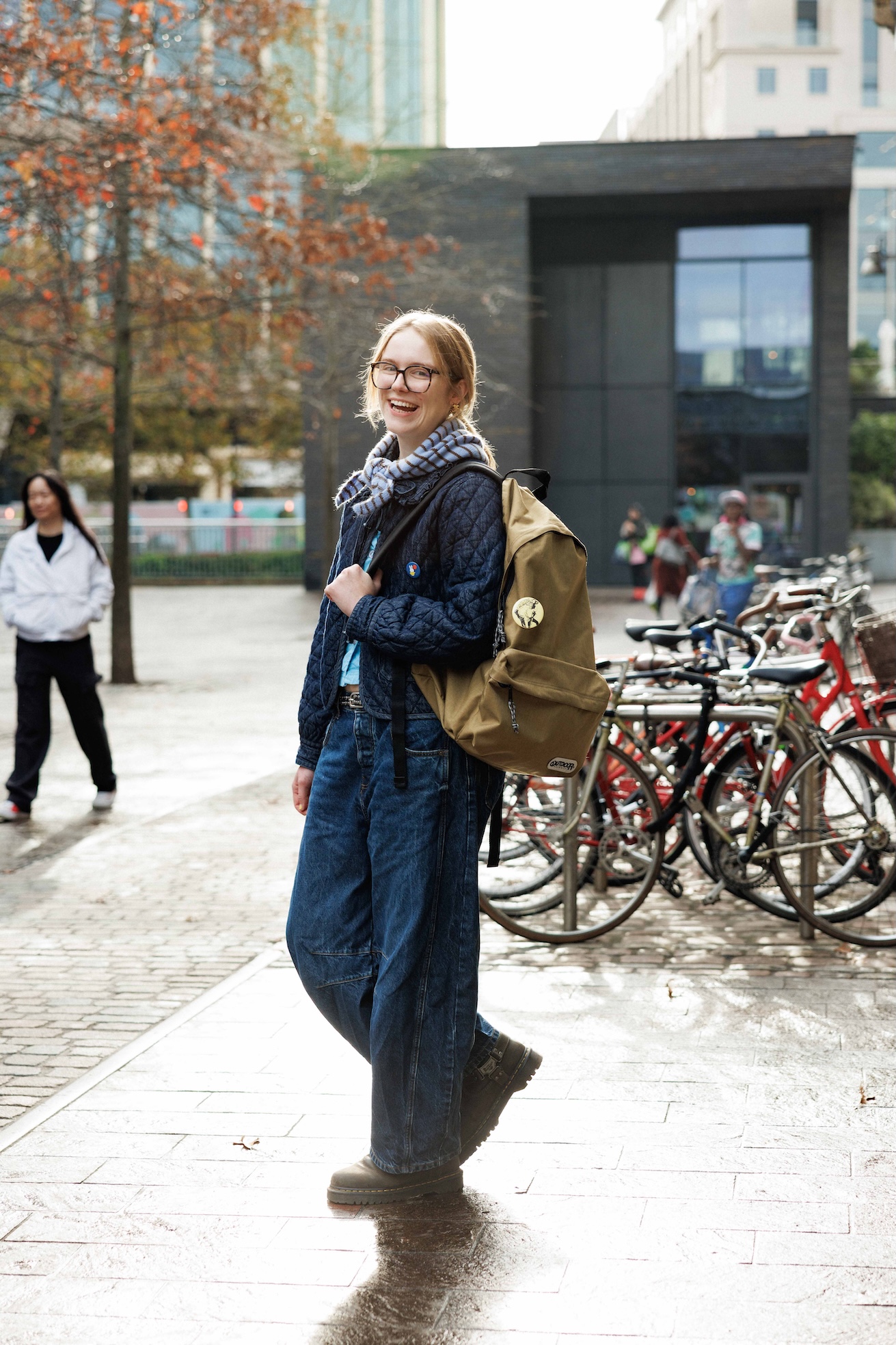 ファッションの名門、セントラル・セント・マーチンズでファッションを学ぶOliviaの相棒は、「デイパック」のラージサイズ。丈夫で大きいから、制作物の用意や課題で荷物が多い日も頼りになるし、コーディネートのポイントとしても一役買ってくれるそう。彼女らしい缶バッチのアレンジも素敵!