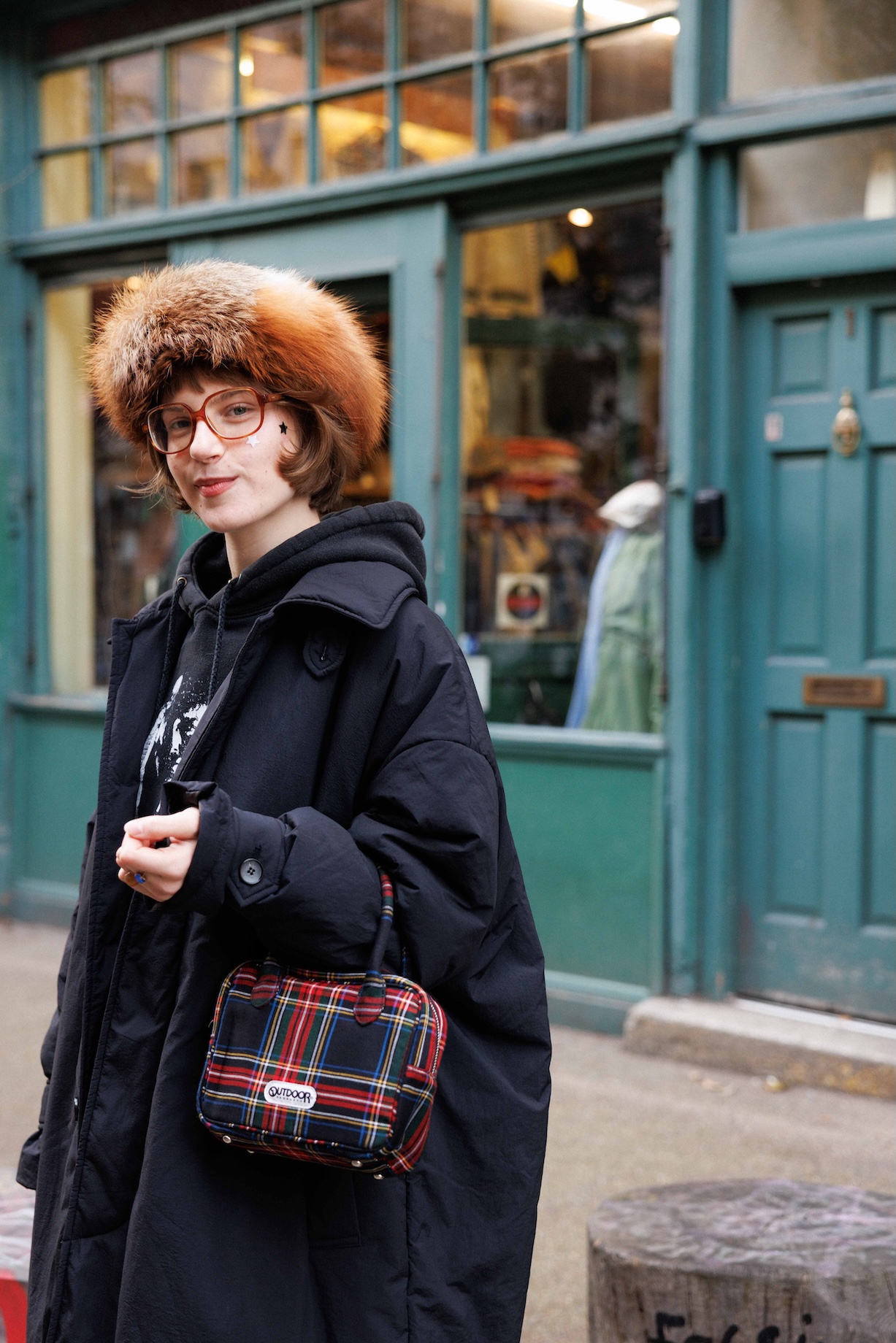 大きな赤いメガネにファーの帽子と、どこかレトロなムードを薫らせながらも、パーカやナイロンコートでストリートな気分をミックス。そして手元にはアイデンティティである“タータンチェック”が主張する、まさに現代のロンドンガール。このバッグひとつで、英国気分がぐっと高まる!