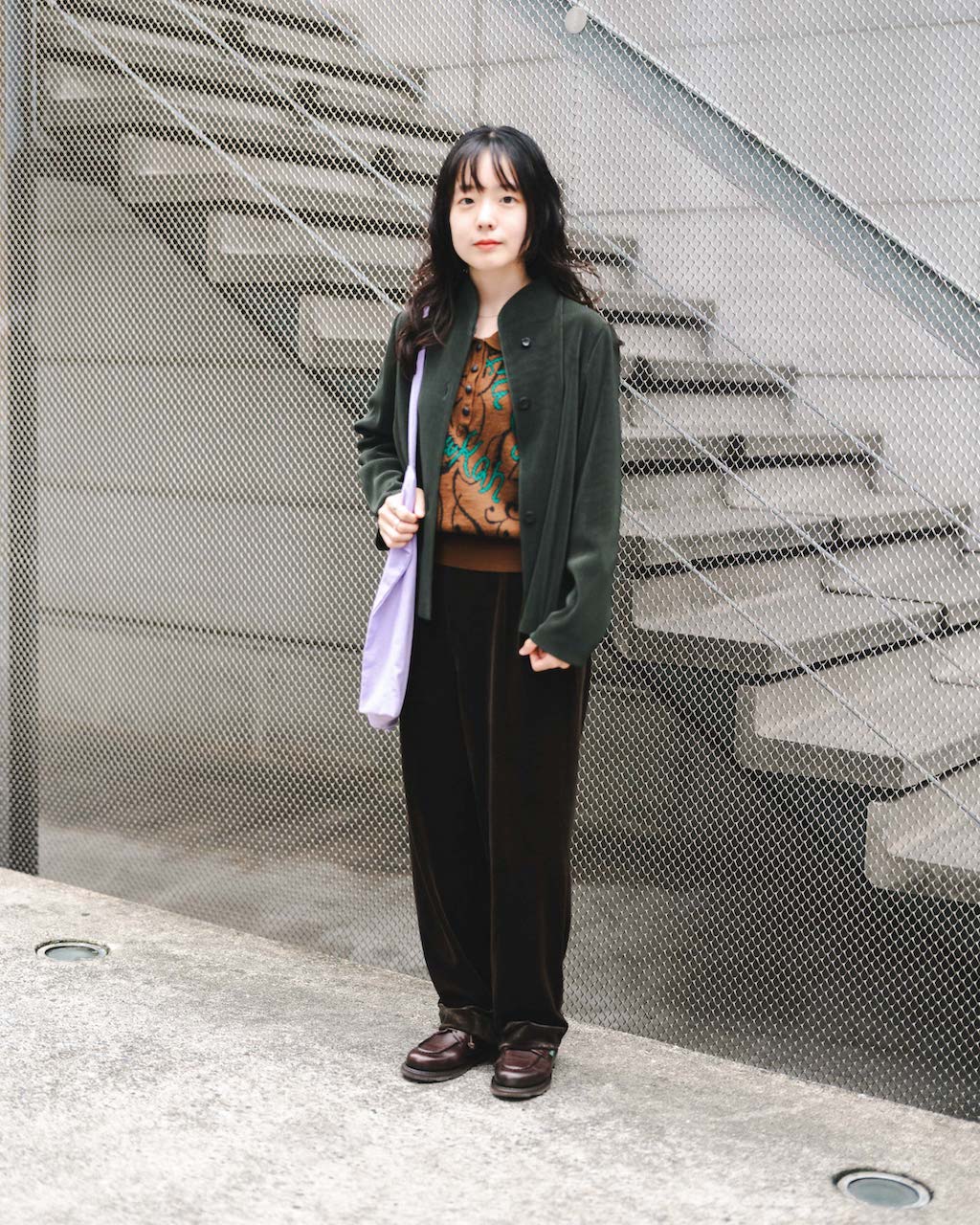 秋冬らしいベロア素材のルーズボトムに、印象的な柄ニットを合わせた個性溢れる古着MIXコーデ。色合いを大人っぽくまとめれば個性的なアイテムも難なく着こなせる。