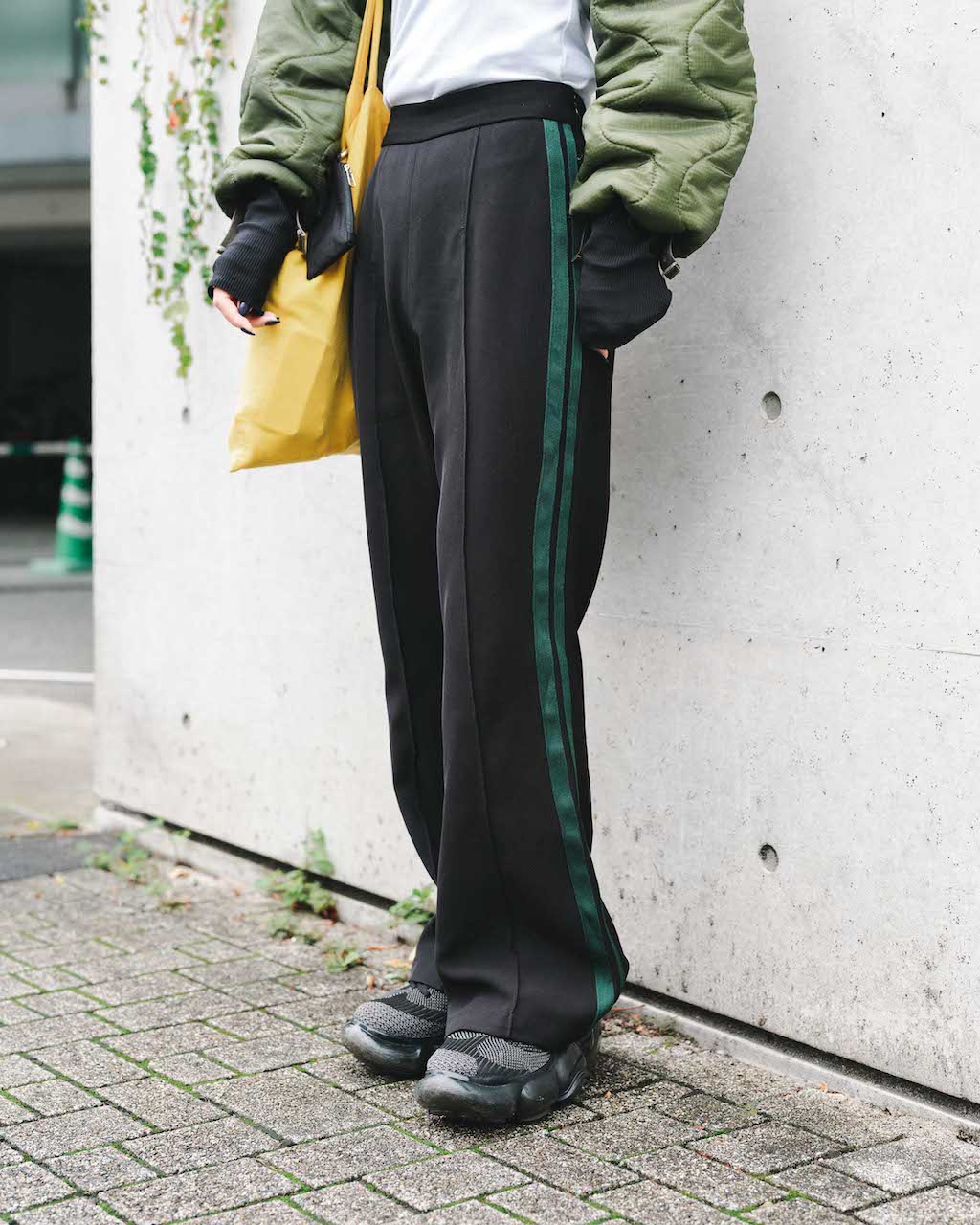 個性的なリメイクアウターとトレンドのトラックパンツでハイセンスなスポーツMIXスタイルに仕上げて。ダークカラーの装いに発色のいいイエローバッグが映える!