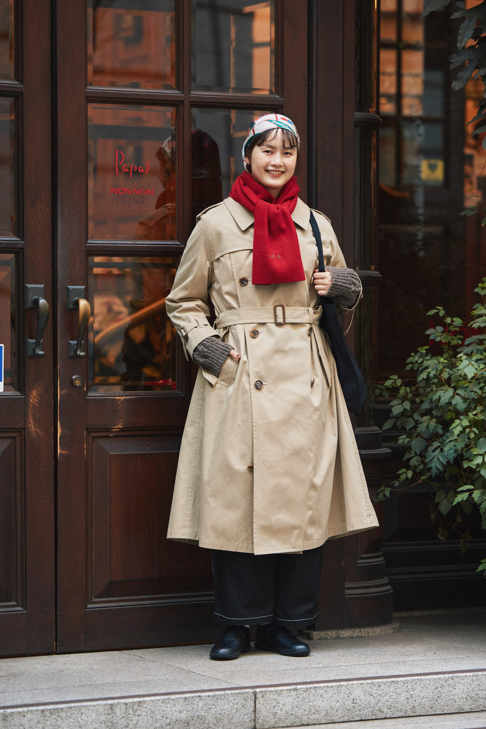 コート¥149600/CIOTA(シオタ)、セーター¥18480/OLDDERBY KNITWEAR(セムインターナショナル)、パンツ¥20900/MANON(エムケースクエア)、スカーフ¥15400/THE SHINZONE(シンゾーン ルミネ新宿店)、マフラー¥22000/A.P.C. × FREAK’S STORE(フリークス ストア渋谷)、シューズ¥25300/SPINGLE(スピングルカンパニー 東京支店)