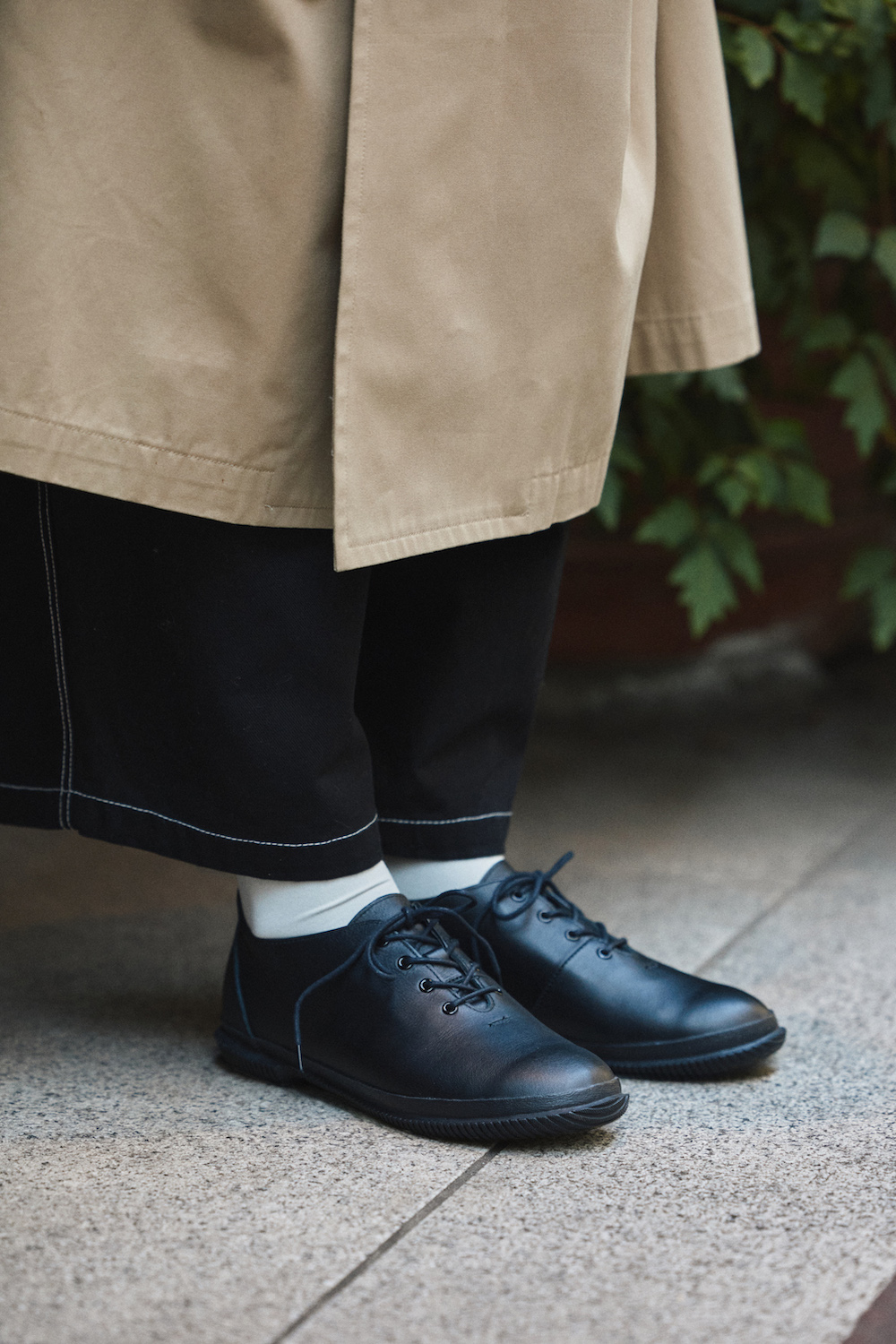 カフェの軒下で雨宿り中の彼女。こんな急な雨でも、《スピングル》のゴアテックス仕様のフラットシューズなら安心!レザーの上品さはありつつ、スニーカーのような軽さと歩きやすさを兼ね備え、さらに防水透湿という頼れる一足。赤いマフラーとスカーフを効かせたエレガントなトレンチコートスタイルと合わせて、パリジェンヌを気取って。