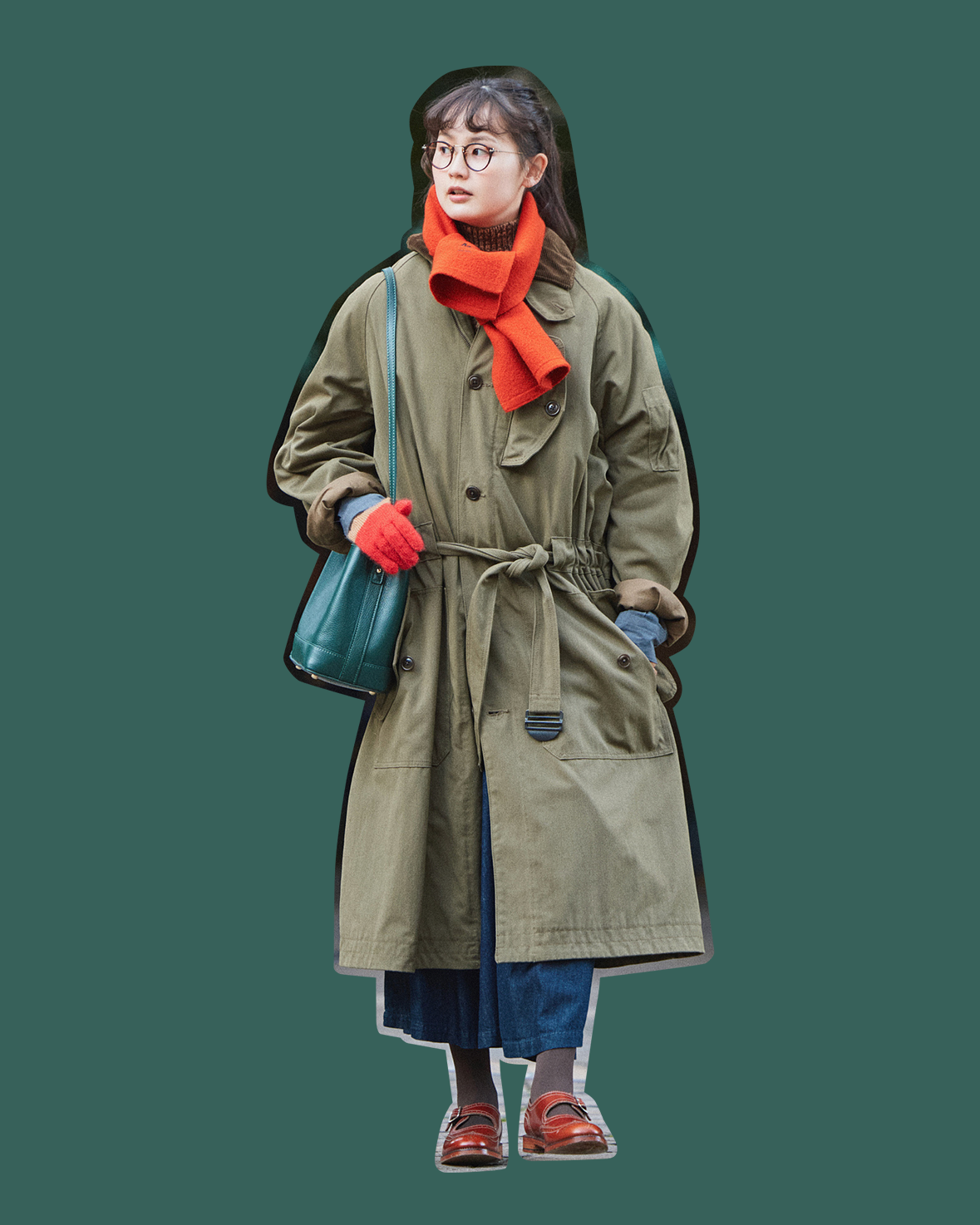コート¥105600/Nigel Cabourn WOMAN(アウターリミッツ)、セーター¥39600、シャツ¥35200/ともにBATONER(バトナー)、スカート¥13200/hinto(マツダ洋品店)、メガネ¥46200/EYEVAN(アイヴァン 東京ギャラリー)、マフラー¥13200/MHL.(エムエイチエル.)、グローブ¥2970/TEMBEA(テンベア トウキョウ)、バッグ¥25300/AULENTTI(セムインターナショナル)、シューズ¥42900/REGAL(リーガル コーポレーション)