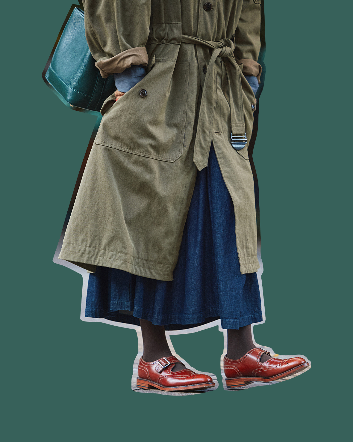 デニムスカートにフライトコートを重ねたスタイルが、パッと目を引いた彼女。このデニムスカートは、岡山県倉敷市にあるセレクトショップ〈マツダ洋品店〉のオリジナルブランド《ヒント》のもの。ほのかな光沢感のある6ozのインディゴデニムを採用し、コートの裾からヒラリと踊るのが魅力。オレンジの小物をトッピングしてチャーミングに!