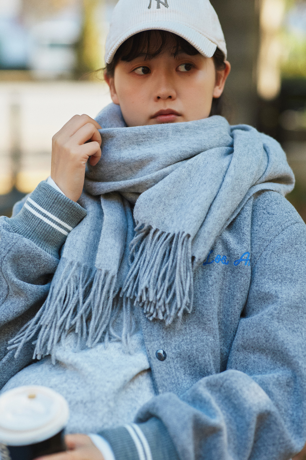 公園のベンチでひと息ついていた彼女。イギリス発のウール専門ブランド《ツイードミル》の大判ストールをぐるっと巻いた姿が愛らしい!ストールを主役に、全体をグレーからアイスブルーのグラデーションで上品にまとめて。首元にボリュームがある分、ワンピースにパンツをレイヤードして重たさを出しているのがグッドバランス。
