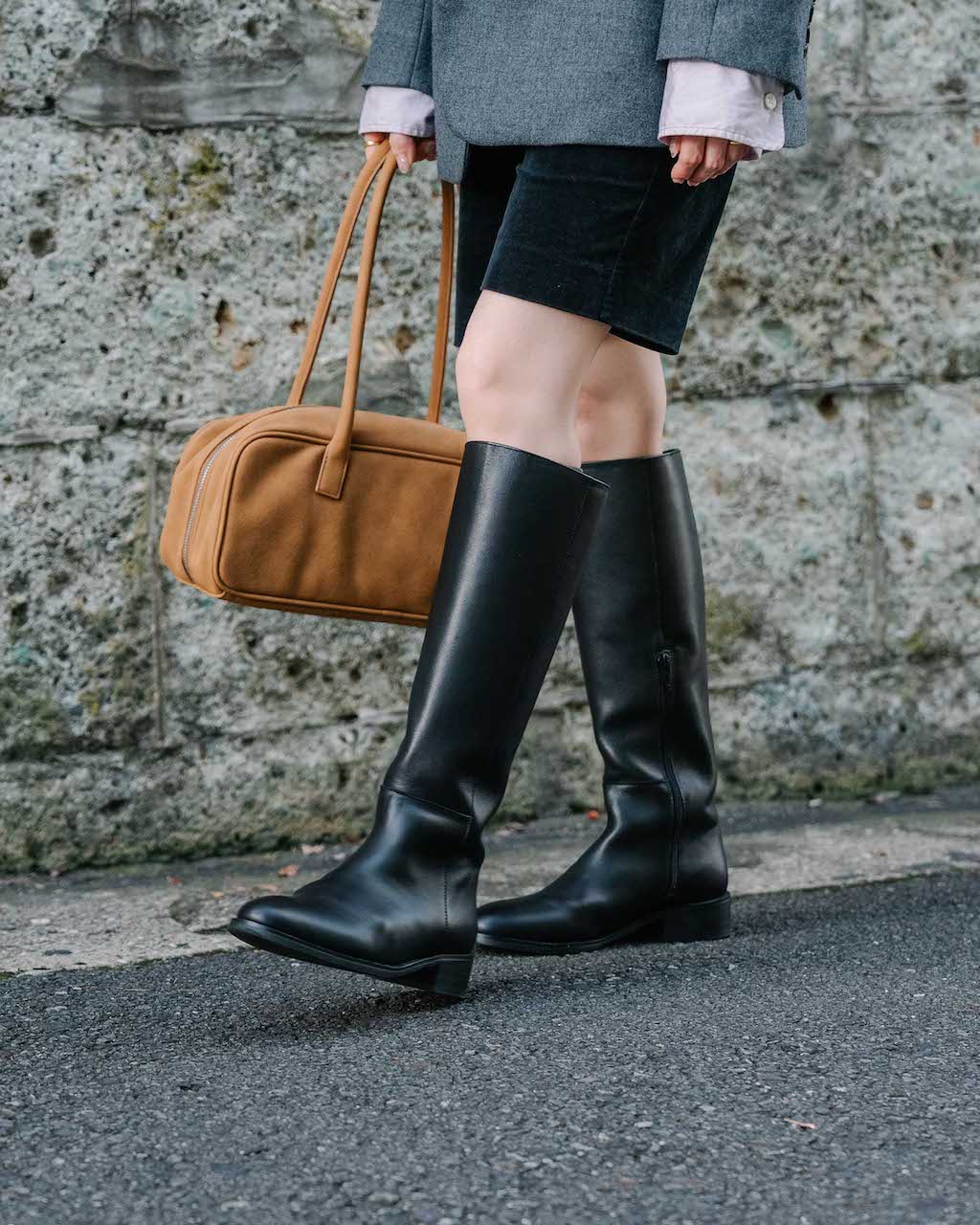 今季は大きめニットにミニボトム&ロングブーツという着こなしがブームの兆し。重厚感のある黒ブーツでバランスよく見せて。黒を基調にすると旬のコーデもトライしやすい。