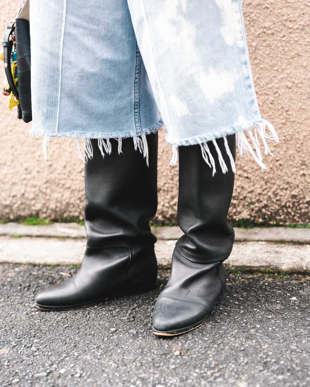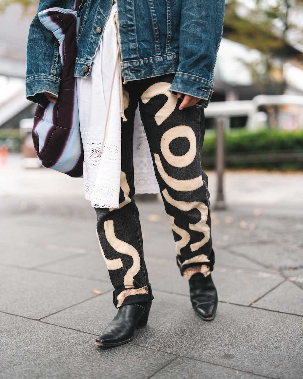 個性的な柄パンツや愛らしさのあるレースアイテムにマッチするヴィンテージの黒ブーツ。インパクトのある服たちを定番のデニムジャケットでデイリーな装いにシフトして。