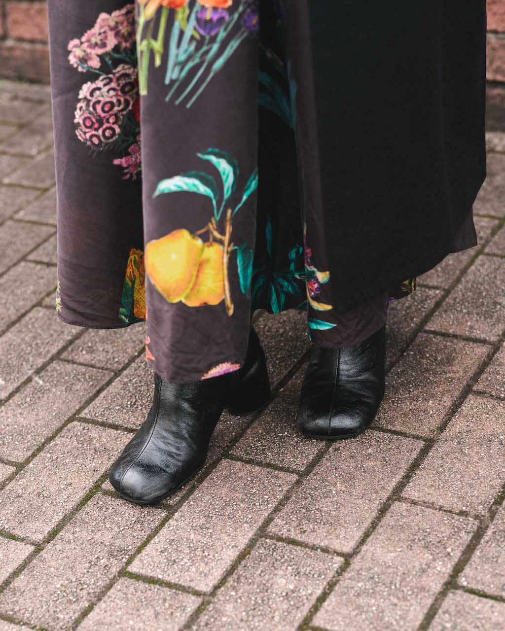 コーディネート4:存在感のある花柄ワンピは黒い足元で引き締めて