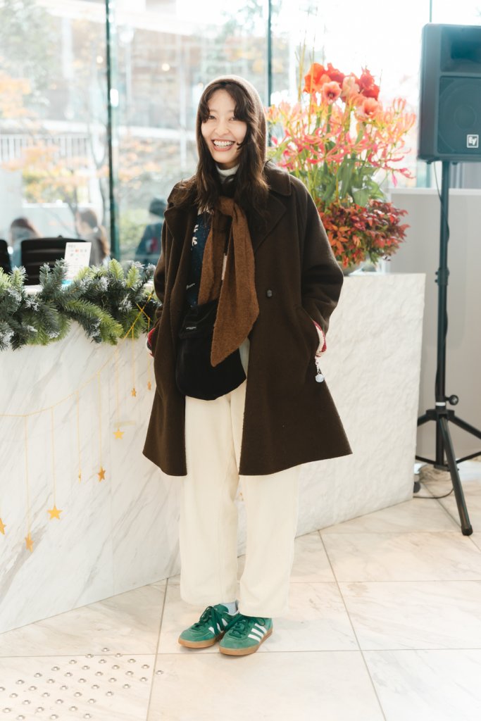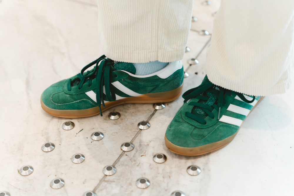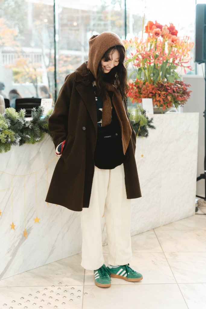 足元には《adidas》のGazelleを合わせ、シンプルでクラシックなデザインを活かした合わせ方が印象的。クリスマスを意識して選んだという鮮やかなグリーンが、落ち着いたトーンの装いに小粋なアクセントをプラス。さらに、パンツの裾からちらりと覗く水色のソックスが、重たくなりがちな冬の足元に軽やかなリズムを添えています。今の季節ならではのムードをまとったスタイル。