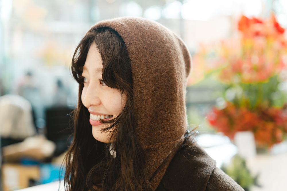 ブラウンのフードマフラーは《ADAM ET ROPÉ》のもので、この日がおろしたて。顔まわりを包み込むボリューム感が、どこか愛らしい。