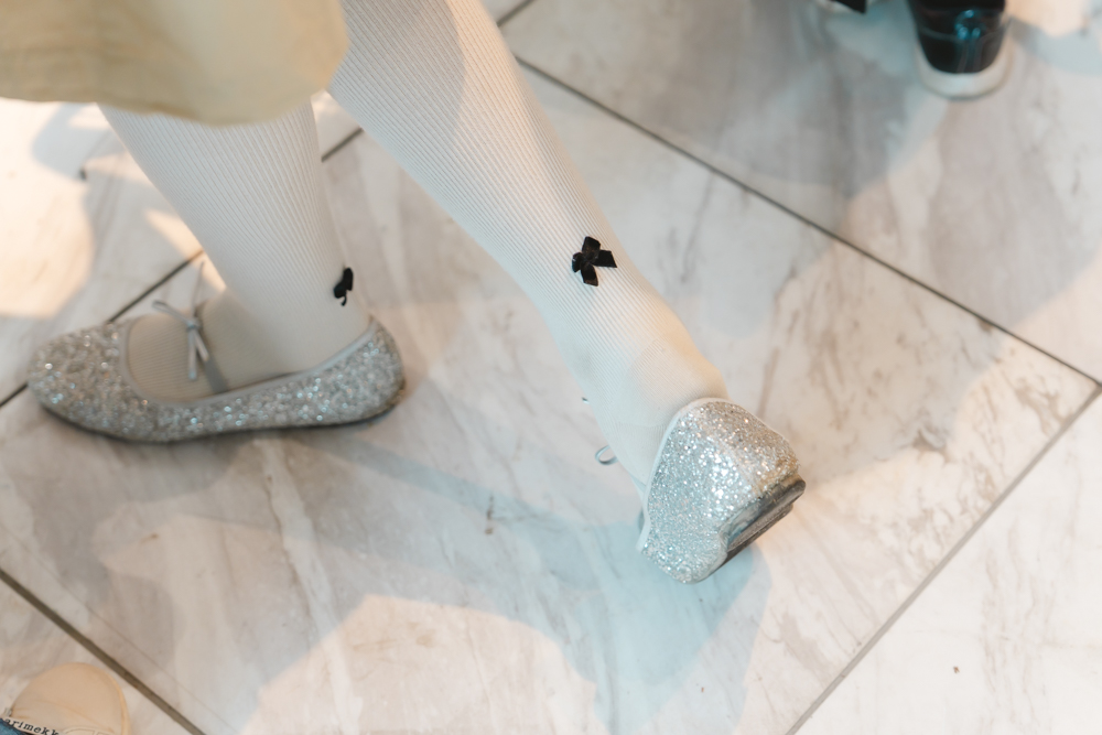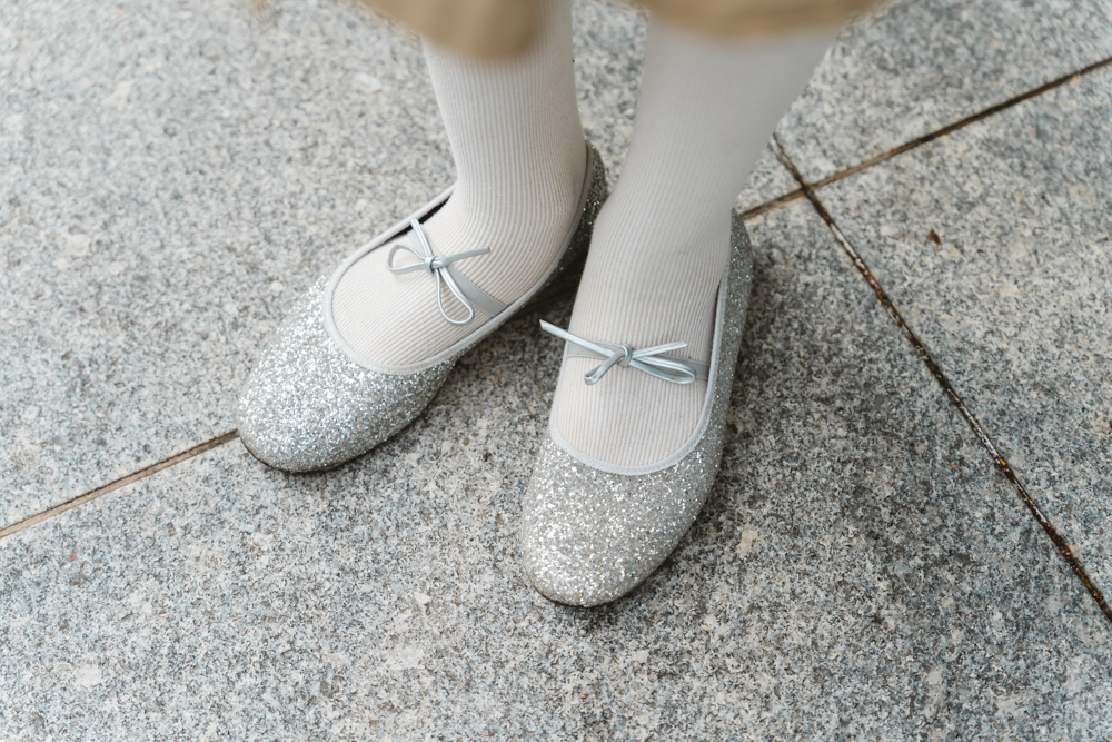中でもひときわ目を引いたのが、足元のレイヤード。シルバーグリッターが華やかに輝くバレエシューズは、マットな細身のリボンディテールが、繊細なきらめきをほどよく引き締めます。合わせた《靴下屋》の白タイツは、足首の後ろに小さなリボンが付いた小粋なデザイン。